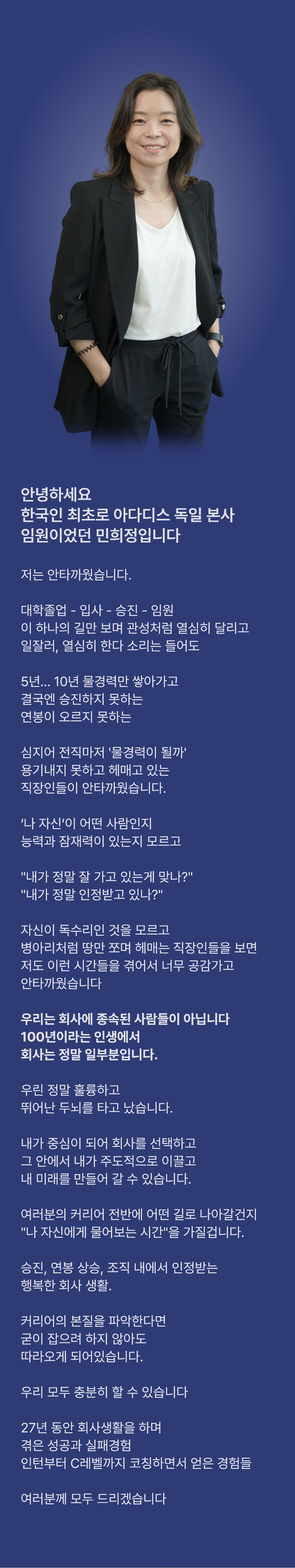 25년간 아디다스 독일 본사를 비롯하여 국내, 외 기업들에서 저의 커리어를 발전 시켜 오면서, 지금은 이 모든 경험을 바탕으로 전문 비지니스 컨설턴트/코치/멘토, 강사, 유투버로 활동 중입니다.
