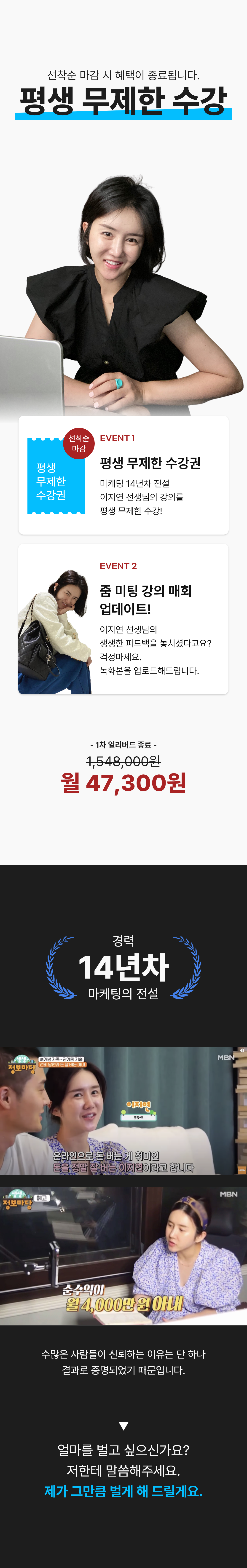 온라인으로 평생 먹고사는 돈버는 기술을 교육합니다. 노력파 마케팅천재 저의 이름은 이지연 입니다. 모든사람들이 가난을 벗어나 돈의결핍에서 자유로운 삶을 살길 바랍니다. 마케팅의 본질은 올바른 정보전달과 개인과 기업의 이윤창출이며, 마케팅을 하는 마케터들은 개인과 기업을 도와야 하는 사람들입니다. 저는 그런 마케터들을 교육하고 양성하는 교육자 입니다.