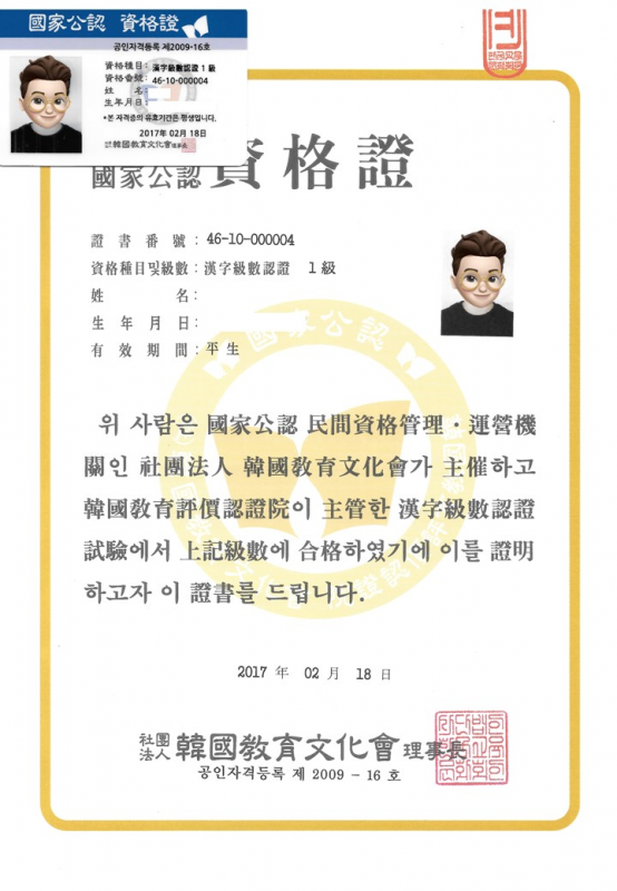 주최하는 한자 급수 인증 시험 1급 자격증 소지자입니다.