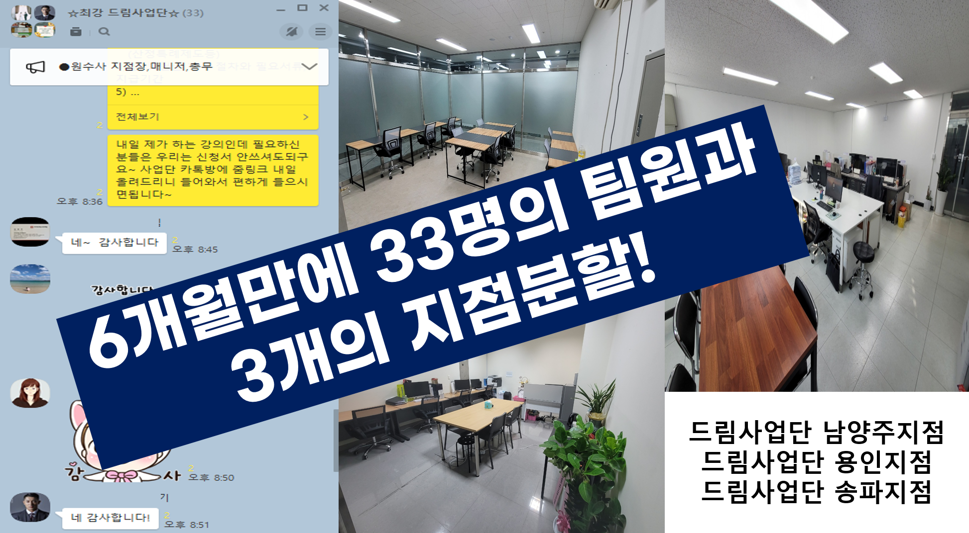 살아남기 힘들다는 보험영업시장에서 33살의 나이에 계약체결율 75%, MDRT 억대연봉 소득을 달성하고 지금은 6개월만에 33분의 팀원을 모집하여 사업단장으로 보험영업과 관리를 하고 있습니다