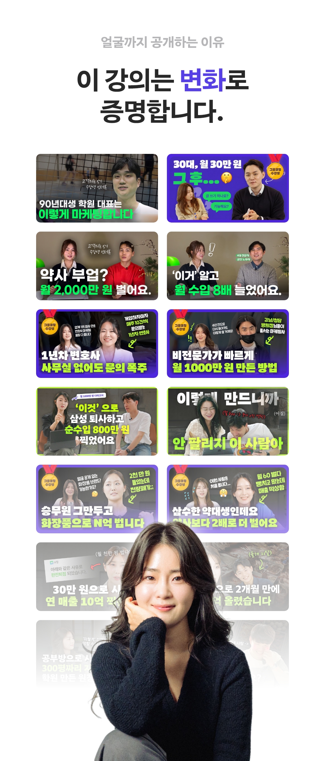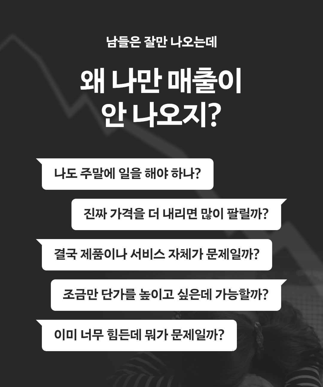 고객의 눈을 적용한 결과 기본 2배 이상 매출 상승은 물론이고 대표님들의 일하는 시간까지 3분의 1로 줄어드는 결과가 4년 동안 꾸준히 나오고 있습니다.