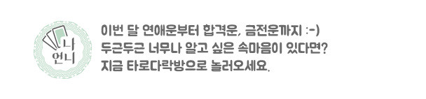 안녕하세요, 저는 타로유튜버 나만아는언니입니다. 유튜브 채널 '나만아는언니의 타로다락방'을 운영하고 있고요, 그동안은 타로만 봐 드렸지만 이번에는 여러분들이 타로카드를 보다 더 잘 이해하고, 스스로 간단한 타로점도 볼 수 있도록 강의를 열었어요.