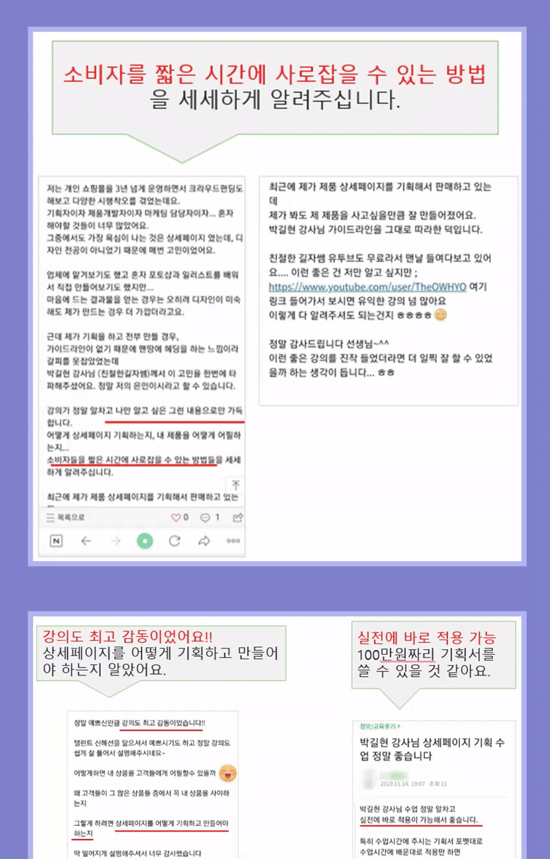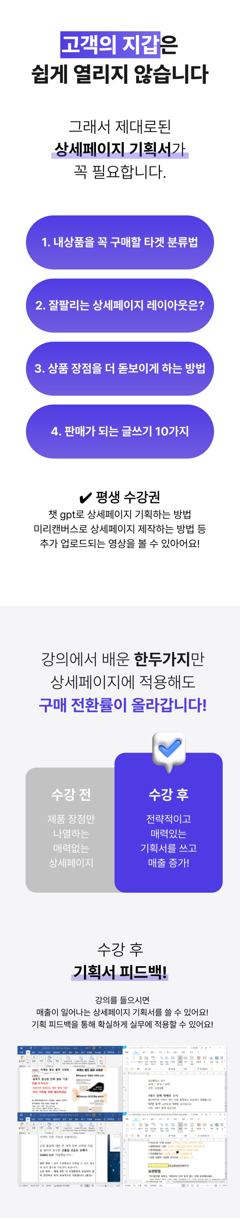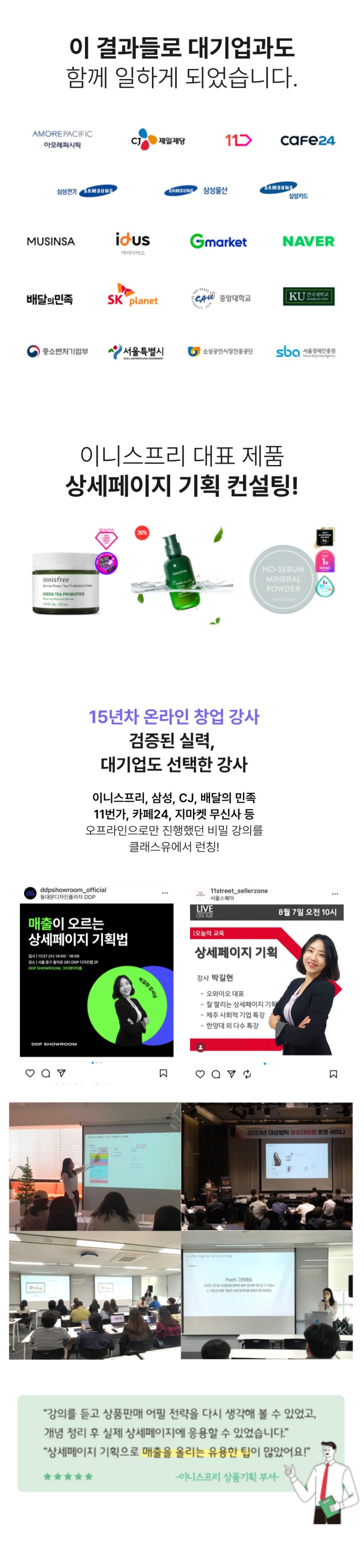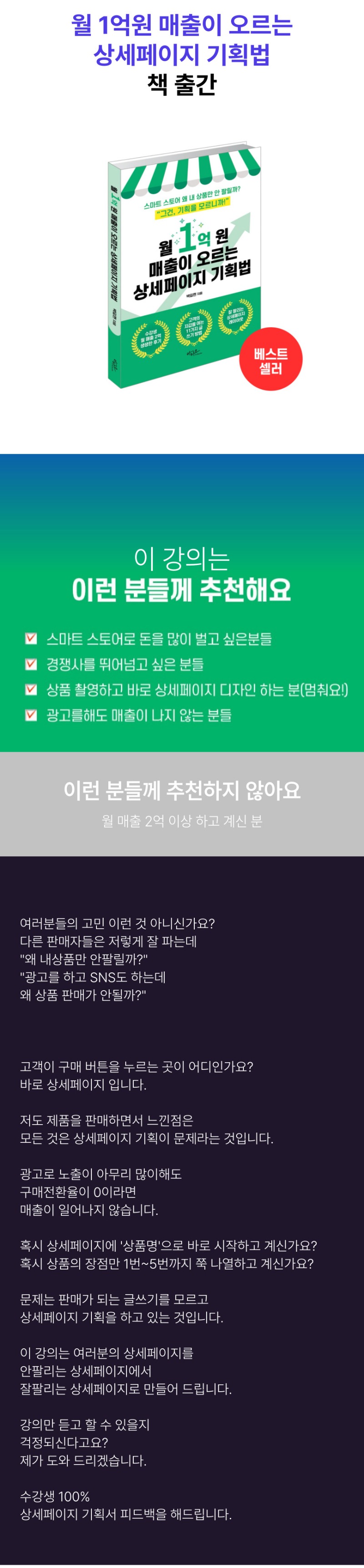 이 강의는 식품, 생활용품, 주방용품, 화장품, 건강식품, 애견용품, 유아용품, 가구 등 기능이 있는 제품의 상세페이지 기획에 100% 도움이 되는 강의 입니다. 이 강의가 클래스유의 다른 강의보다 금액이 높은 것을 알고 있습니다. 메일로 기획서를 보내주시면 1:1로 기획서를 보고 수정해서 피드백을 해드리고 있습니다. 피드백을 빼고 더 저렴하게 강의를 런칭할까 고민했지만 초보자분들에게는 피드백이 꼭 필요하다고 생각하여 현재 가격을 고수하고 있습니다. 일부러 강의수를 40강, 60강 늘리지 않고 딱 필요한 내용만 담았습니다.