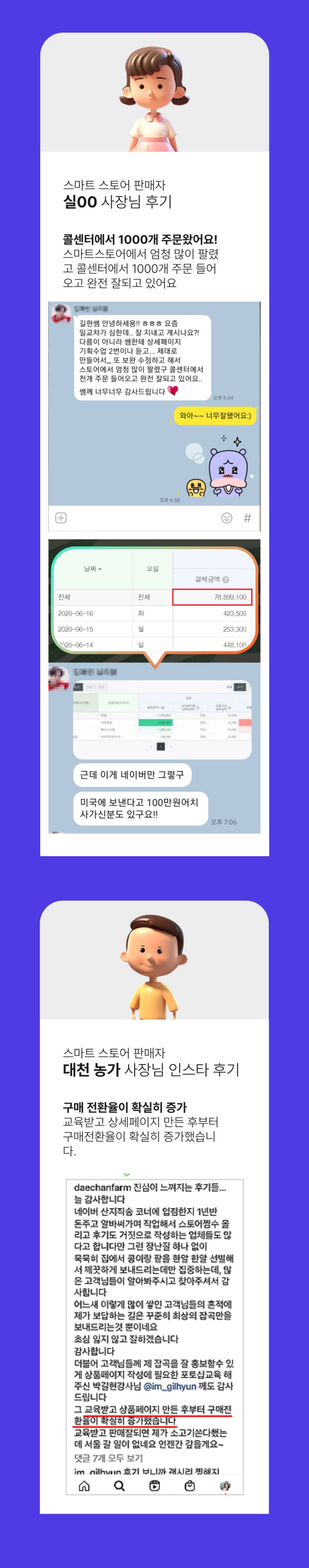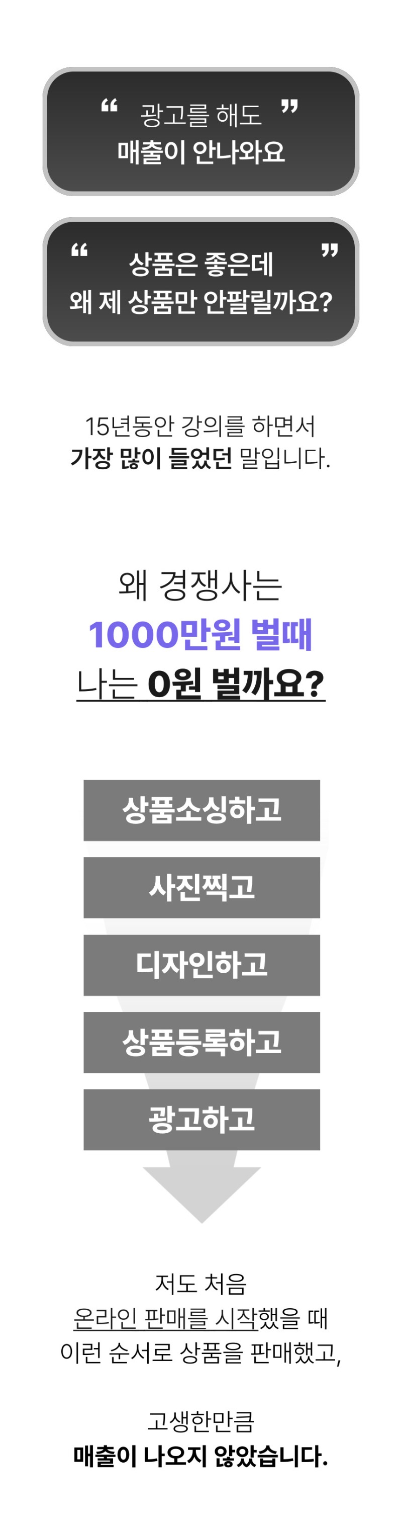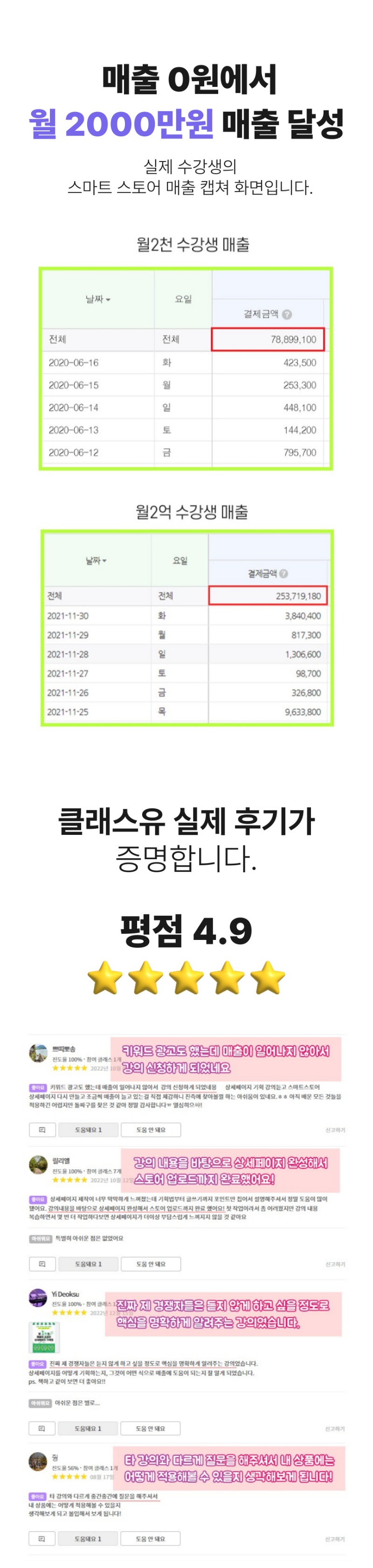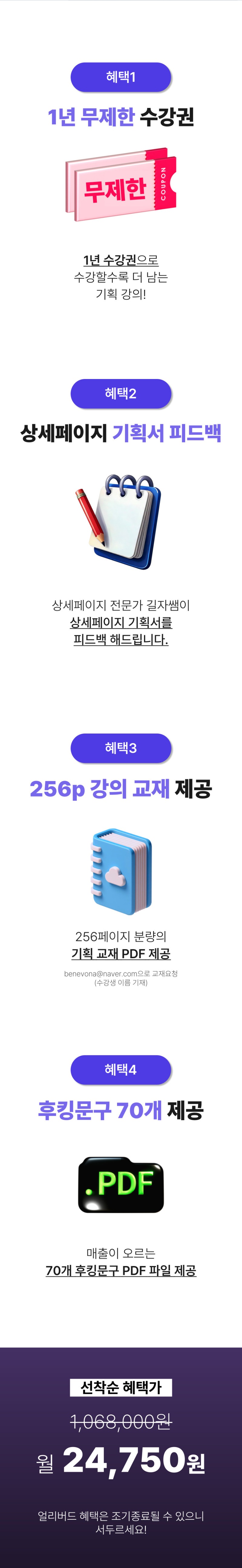 이 강의는 식품, 생활용품, 주방용품, 화장품, 건강식품, 애견용품, 유아용품, 가구 등 기능이 있는 제품의 상세페이지 기획에 100% 도움이 되는 강의 입니다. 이 강의가 클래스유의 다른 강의보다 금액이 높은 것을 알고 있습니다. 메일로 기획서를 보내주시면 1:1로 기획서를 보고 수정해서 피드백을 해드리고 있습니다. 피드백을 빼고 더 저렴하게 강의를 런칭할까 고민했지만 초보자분들에게는 피드백이 꼭 필요하다고 생각하여 현재 가격을 고수하고 있습니다. 일부러 강의수를 40강, 60강 늘리지 않고 딱 필요한 내용만 담았습니다.