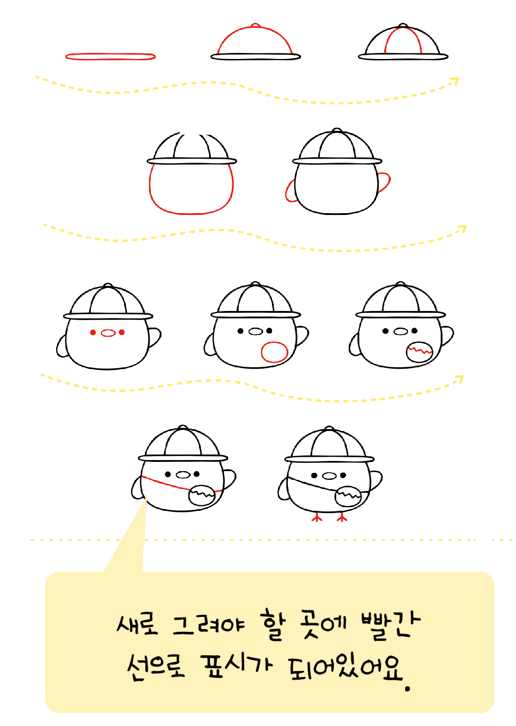 복잡하게 공부하는 건 너무 부담스럽고 지치니까 놀이하듯 빨간선을 보고 쓱쓱 따라그리기만 하면 귀여운 일러스트가 완성될 수 있도록 영상을 만들었는데 많은 분들이 좋아해주셨어요.