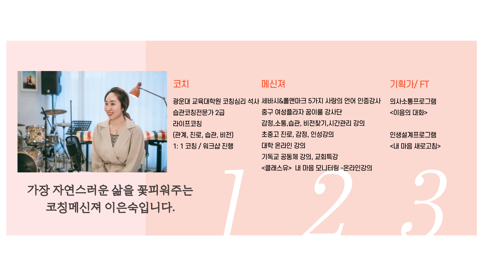 가장 자연스러운 삶을 꽃피워주는 코칭메신져 꿈달코치로 살아가고 있습니다.