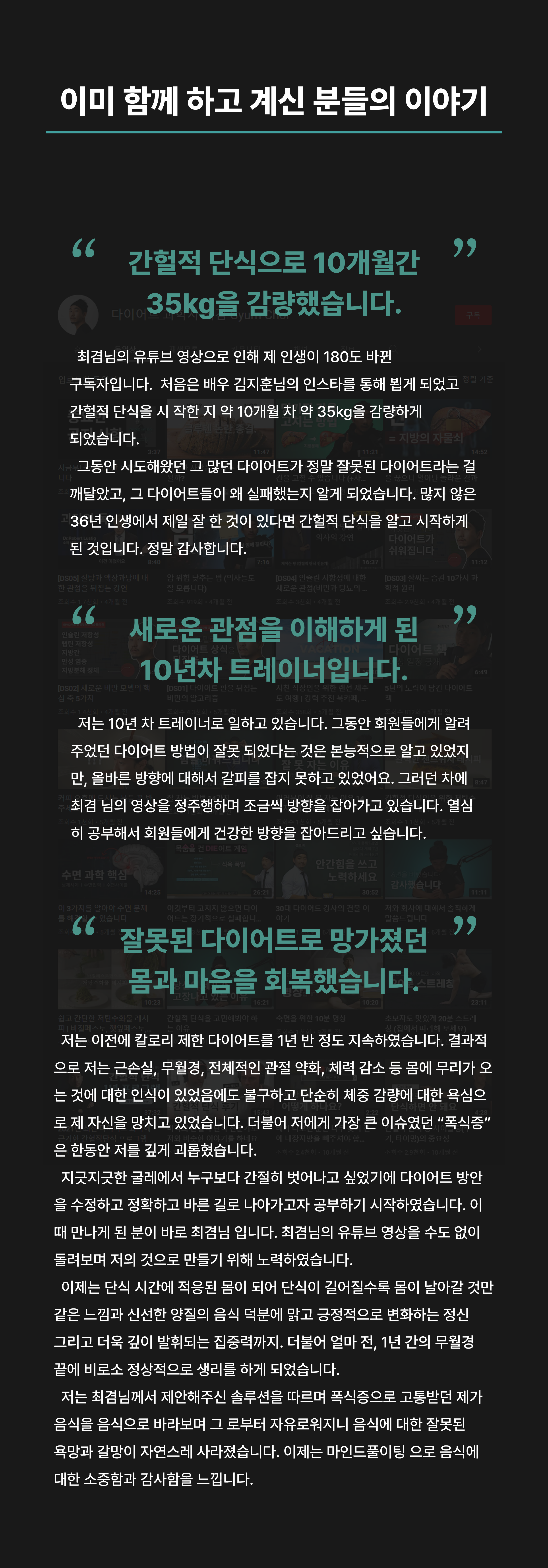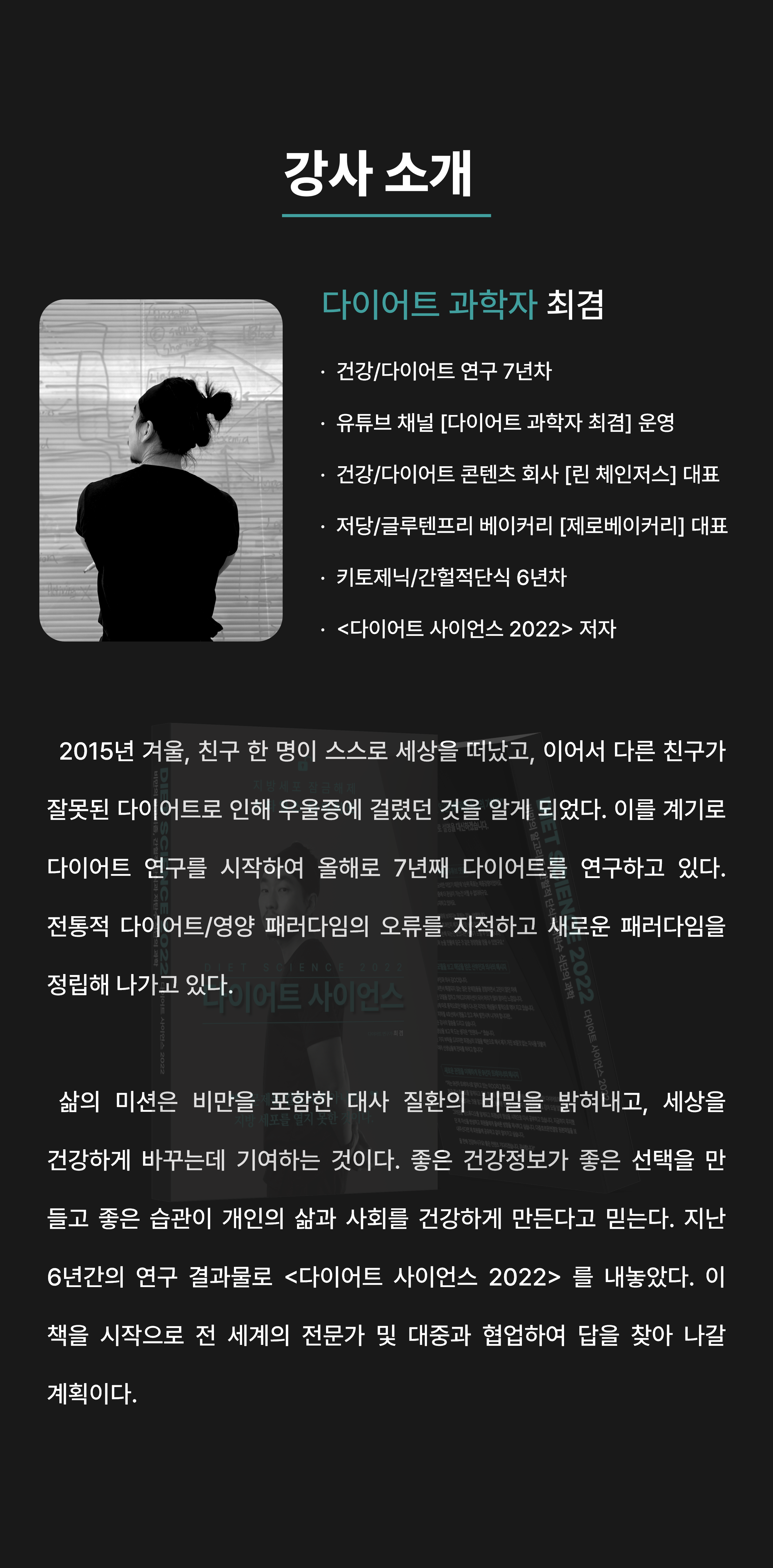 삶의 미션은 잘못된 건강 정보를 검증하고 바로 잡는 것이다. 그가 이런 일을 하는 이유는 잘못된 건강 정보가 누군가의 몸과 삶을 어떻게 망치는지 보았기 때문이다. 반대로 좋은 건강 정보는 누군가의 생명을 살릴 수 있다고 믿는다. 좋은 정보와 콘텐츠의 힘을 믿기에, 오늘도 새벽 4시 30분에 일어나 연구와 콘텐츠 제작에 힘쓰고 있다.