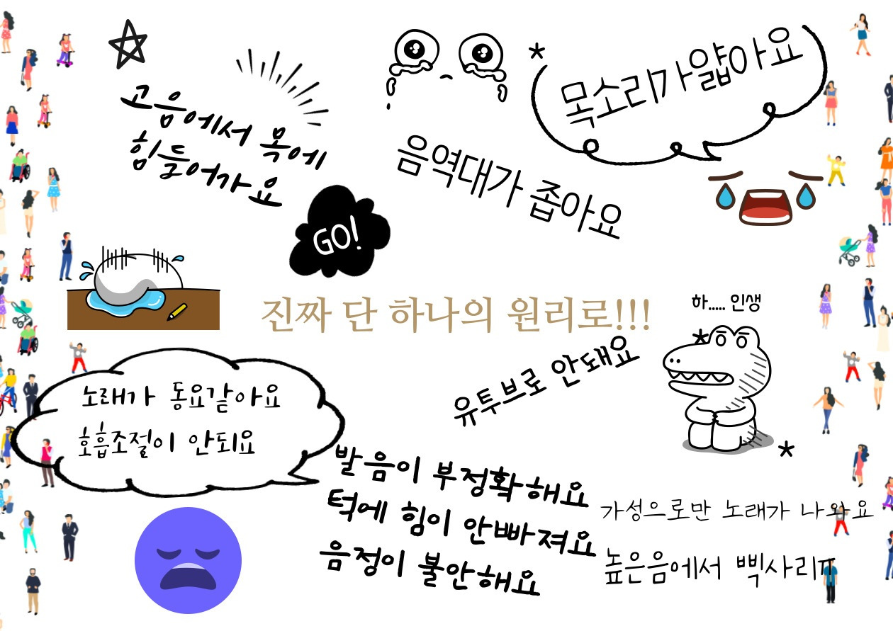 그것이 좋은 트레이닝이라는 착각을 하시는분들도 많죠, 하지만 인식이 바뀌지 않으면 문제도 보이지 않고 제대로 된 해결도 당연히 없습니다. 인식이 바뀌면 방법은 따라오게되어있고, 노래를 잘부르게되는 것은 운전보다 쉬워질것입니다.
