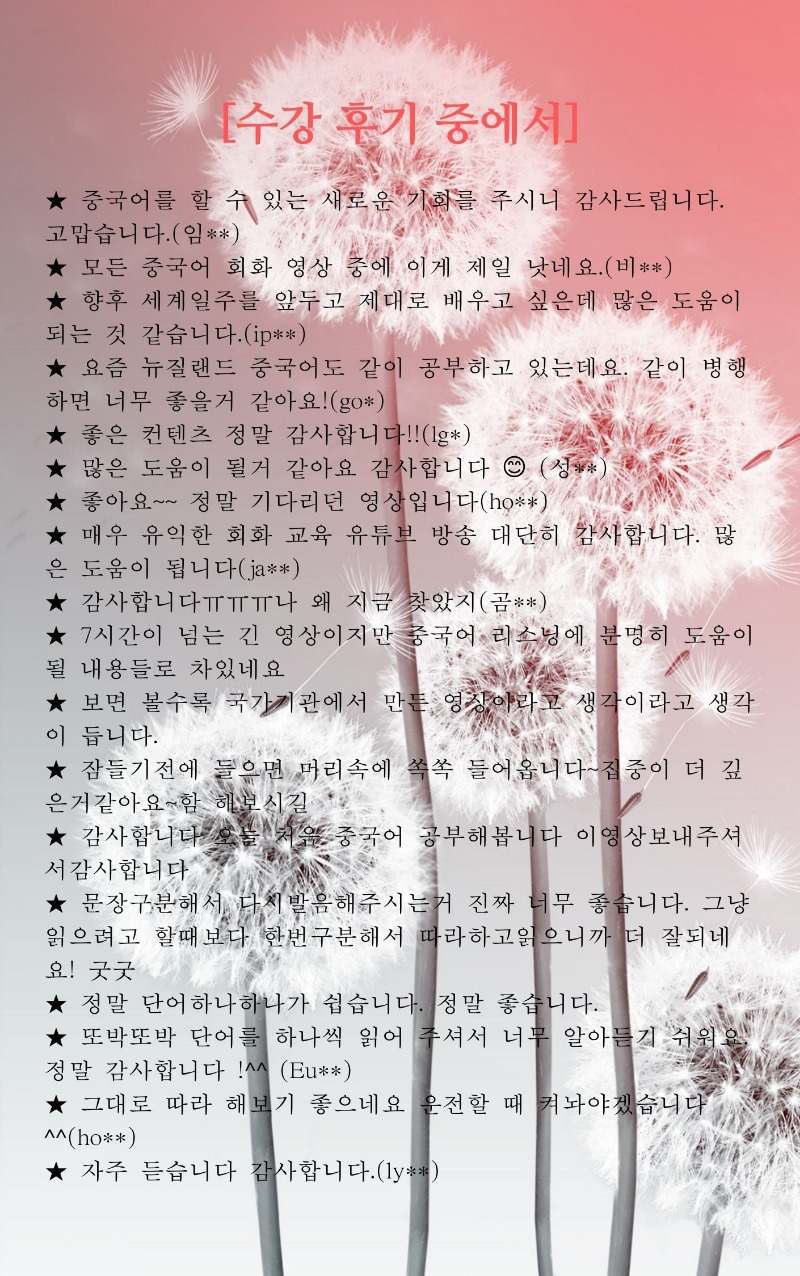 ★ 요즘 중국어에 관심이 많은데 이런 영상 너무너무 감사합니다!!(엥**)