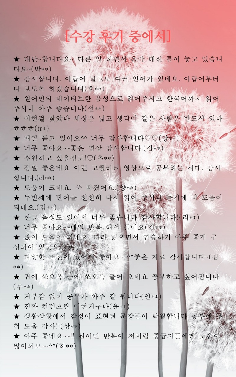 ★ 아주 좋네요~~!! 원어민 반복이 저처럼 중급자들에겐 도움이 많이되요~~^^(하**)
