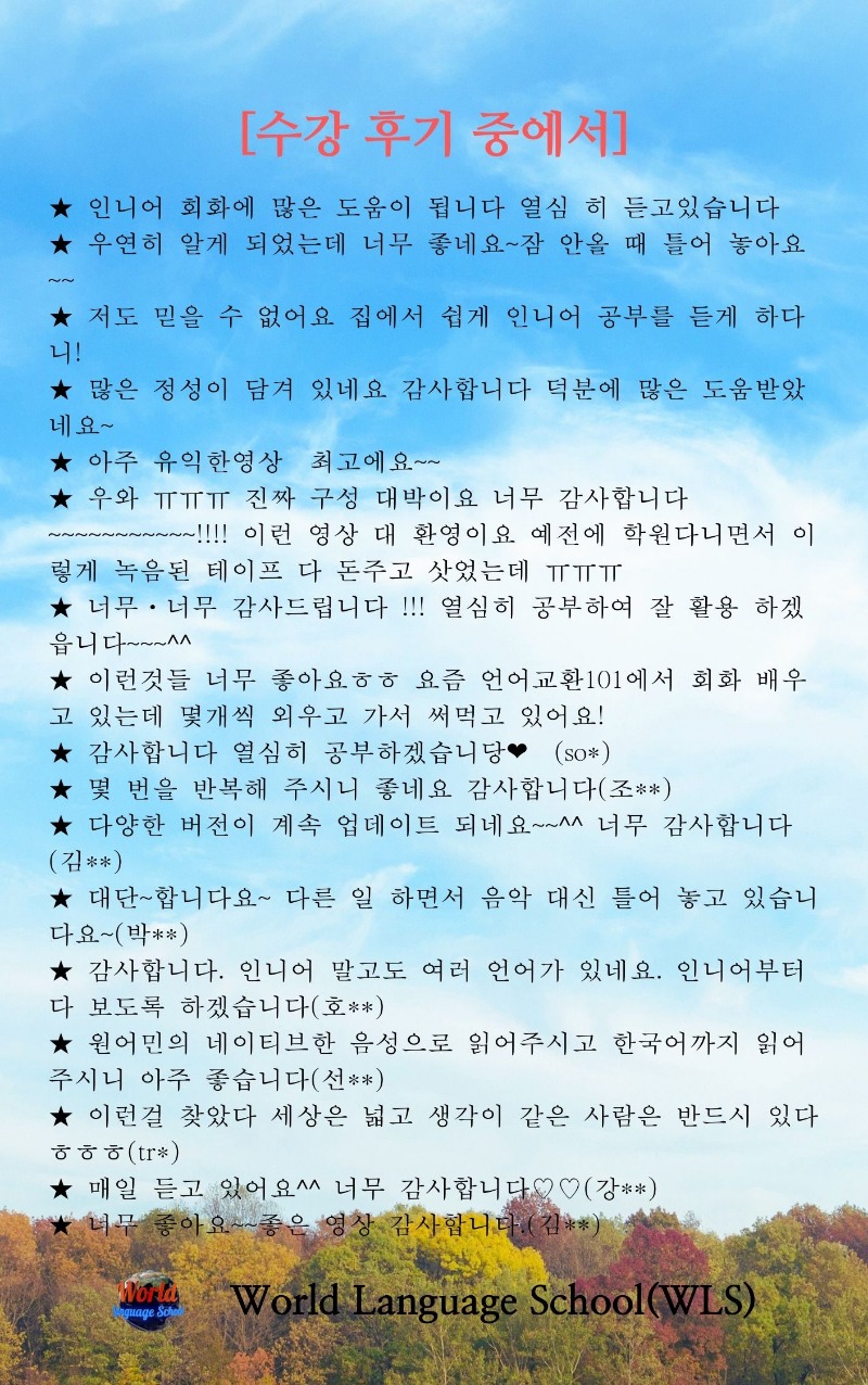 World Language School(WLS)은 전 세계 외국어를 배우는 40여개국 학생들에게 20여개 대표 언어를 대상으로 현지인이 가장 많이 사용하는 문장들을 발취하여 언어 교육을 제공하고 있습니다.