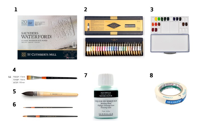 이 수업에서는 수채의 다양한 기법이나 색 배합 등을 자세하게 설명하지 않습니다.