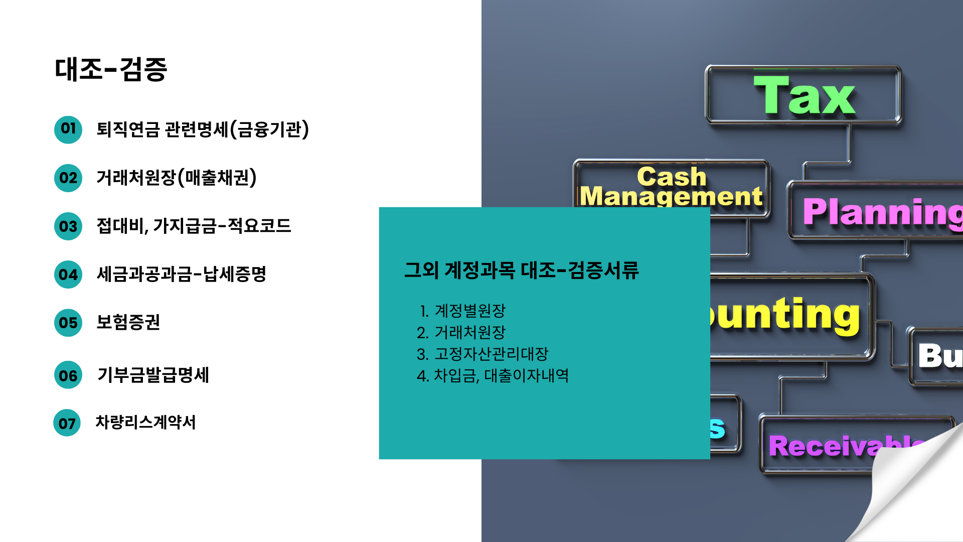 기업의 계정별원장의 각 계정과목 합계와 법인세 신고시 제출되어져야 할 계정과목의 합계가 맞아야 하며, 지출증빙수취, 세금신고와 맞는지 확인하여야 합니다.