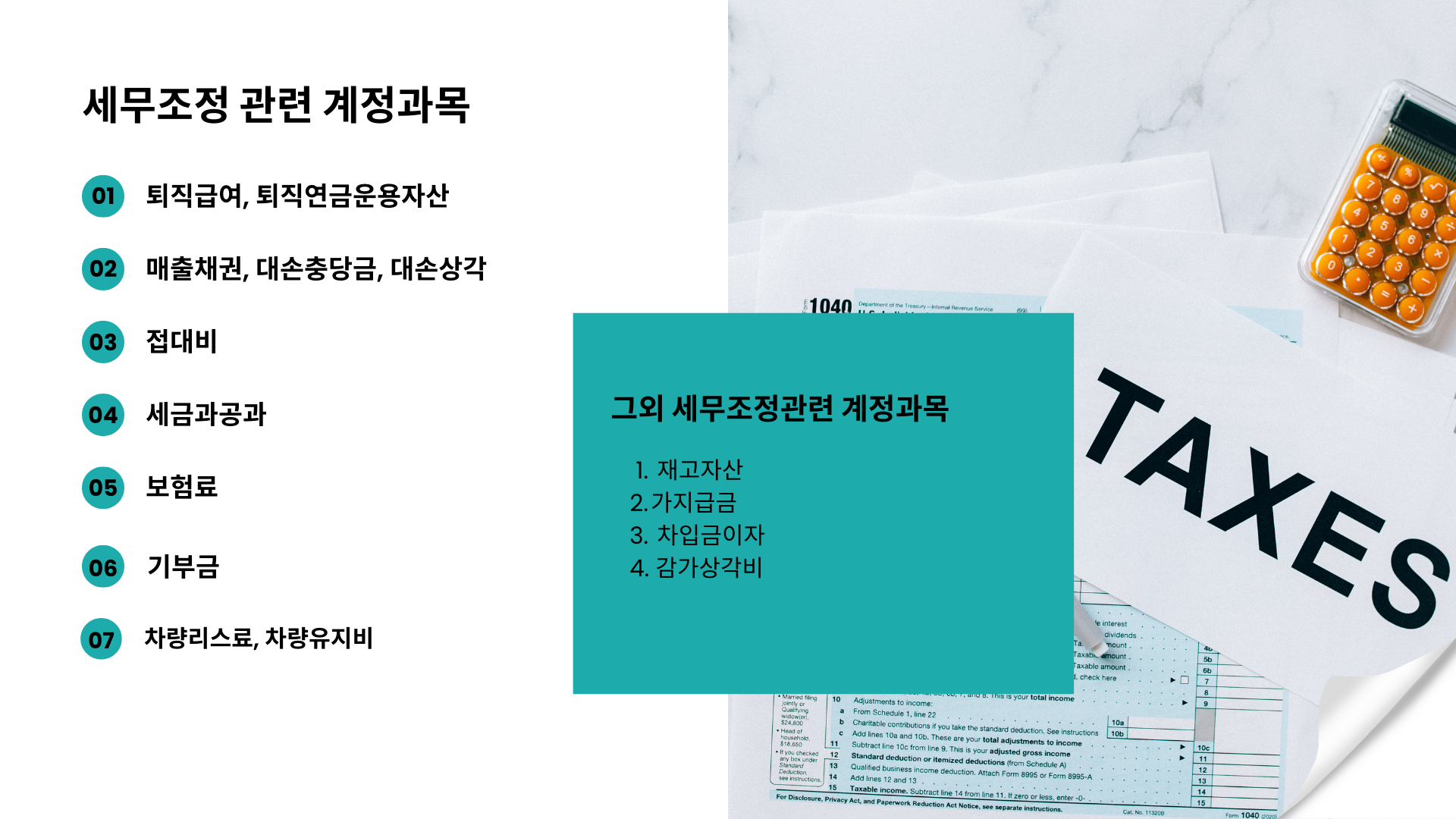 세무조정은 계정과목에서 비용으로 인정받지 못하는 부분과, 한도초과로 이루어지는 계정과목, 사업용 자산으로 사용되지 않는 자산과, 업무와 관련없이 이루어지는 비용을 조정하는 것에서부터 시작됩니다.