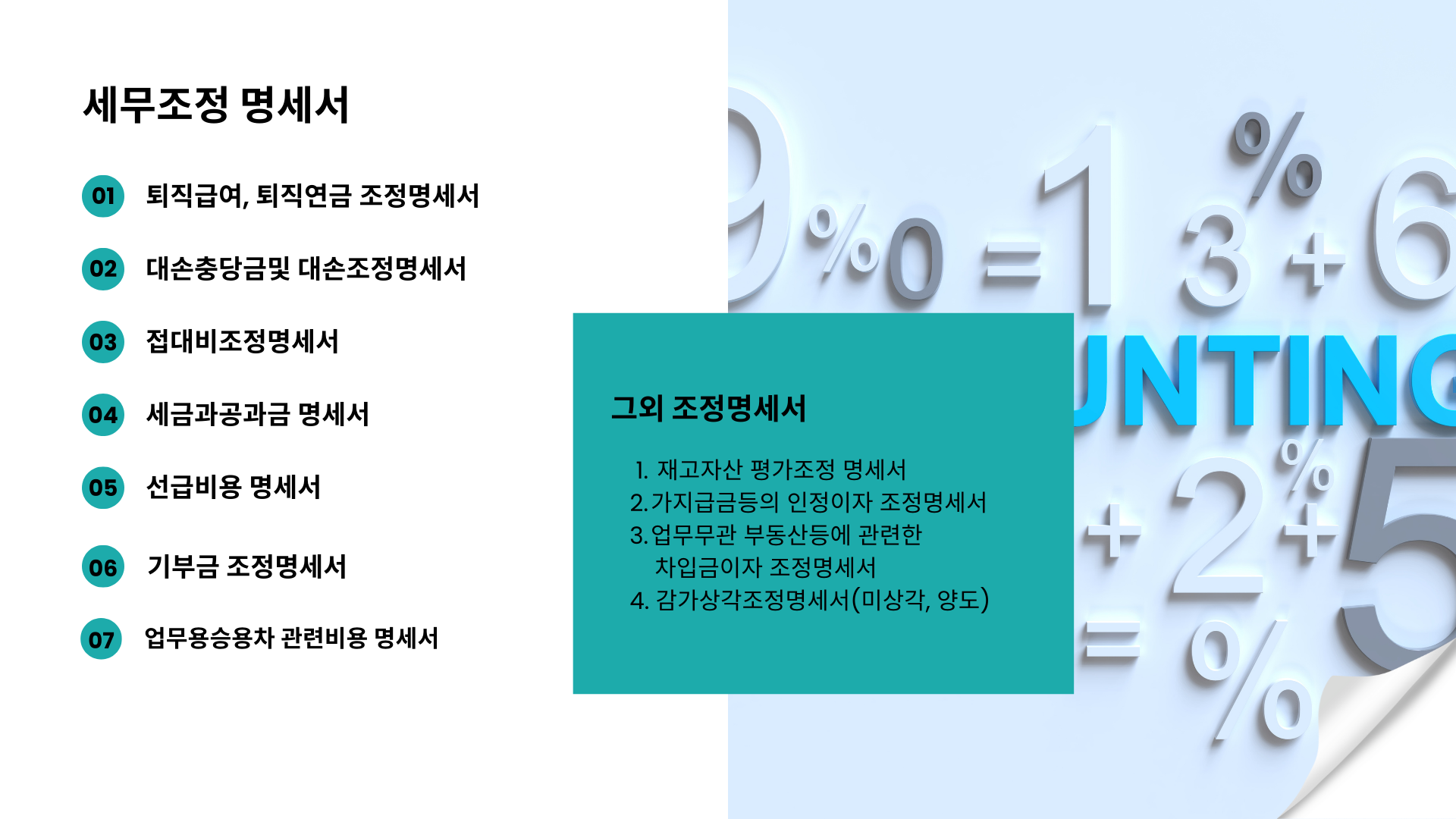 그렇지만, 계정과목에 대해 정확한 기록이 이루어졌다면 어려운것은 없습니다. 중소기업의 경우, 이론처럼 모든 계정과목의 세무조정이 이루어지는 것은 아니기때문에, 어려운 세무조정은 스킵하고, 중소기업에서 주로 많이 다루는 세무조정에 대해 설명드리겠습니다.