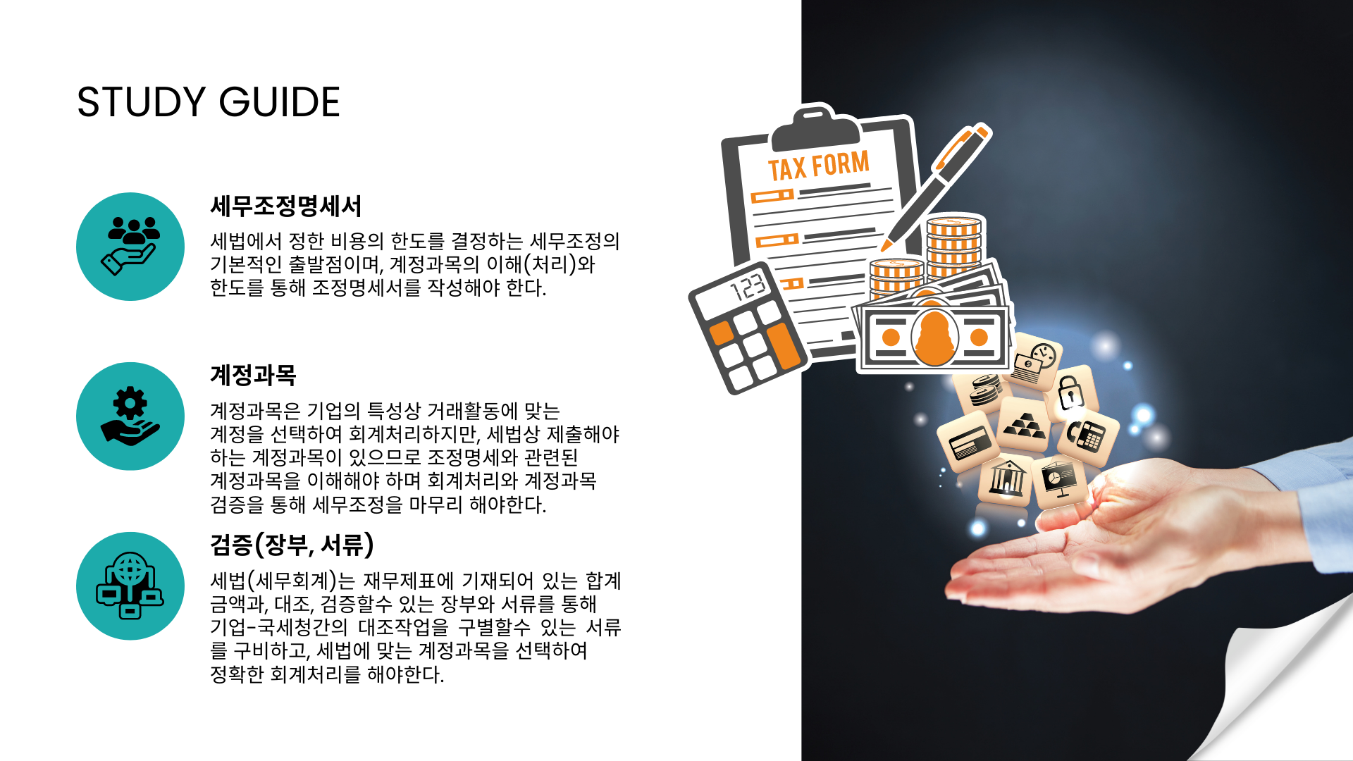 재무제표에서 나타나는 계정과목 합계와 세금신고된 부분을 일치시킨후, 세법에서 적용되지 못하는 손익을 조정해야 합니다.