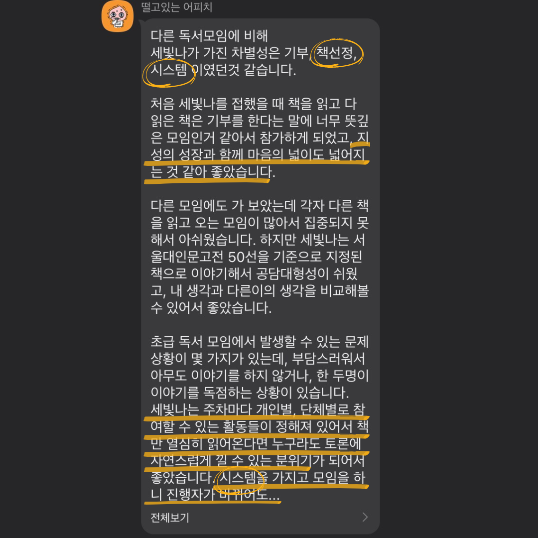 그래서 독서모임을 통해 함께하는 시스템을 만들었어요.
