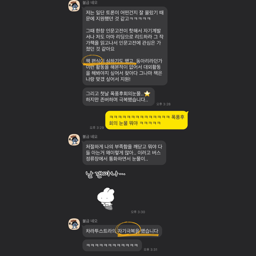 그전에 저는 한 번도 다른 독서모임에 참여한 적이 없어요.