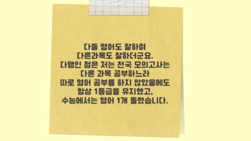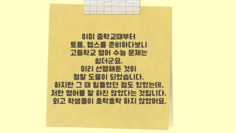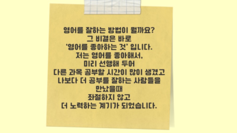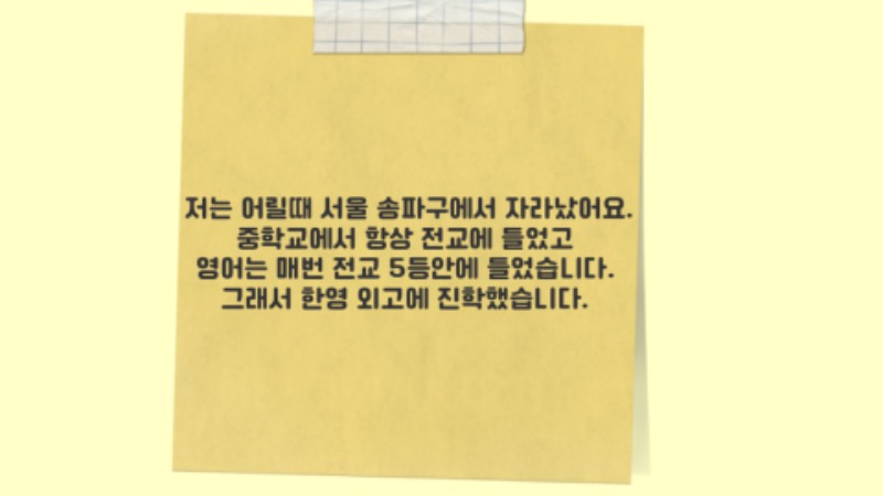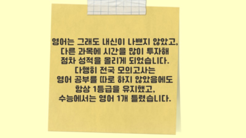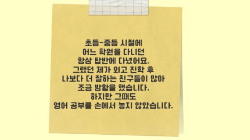 저는 유년기 부터 다른 과목보다 영어를 잘 했고, 초•중 과정 다양한 어학원에서도 항상 탑 반에 들었습니다. 그 이유는 영어를 좋아했고 꾸준히 공부를 했기 때문입니다. 토플, 토익, 텝스 점수는 고등학교때 이미 만들어 놓았던 덕분에 대학 수학 능력 시험은 따로 영어를 공부하지 않고도 1등급을 받았습니다.