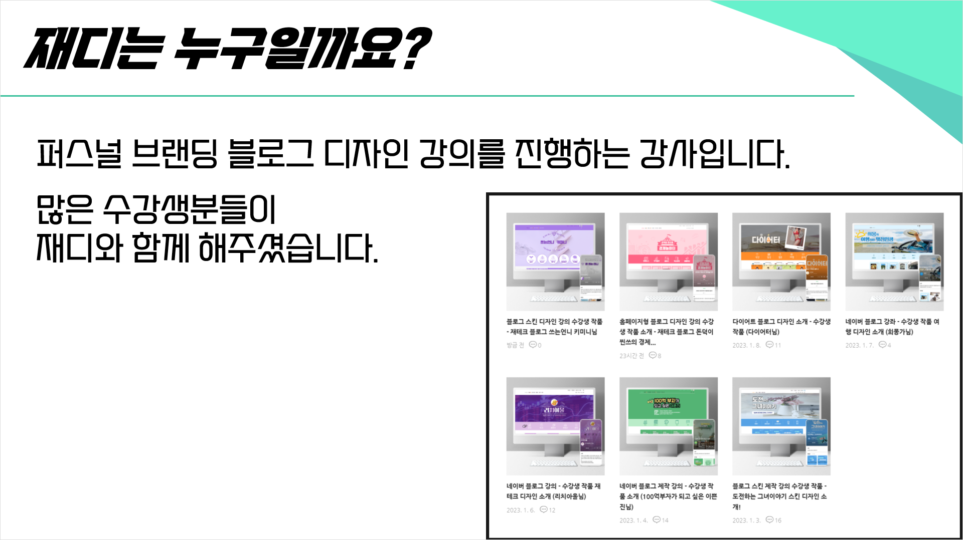 재디는 퍼스널 브랜딩 블로그 디자인 강의를 진행하는 강사입니다.