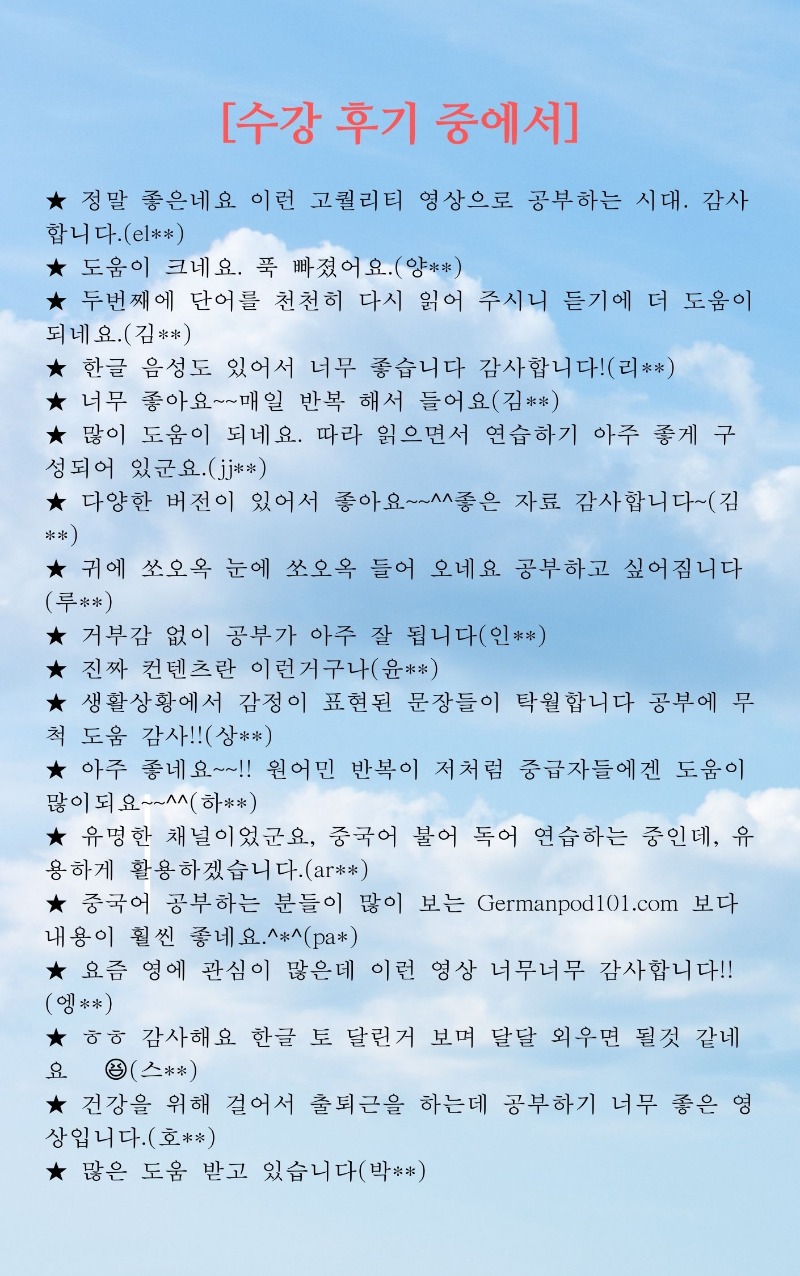 ★ 또박또박 단어를 하나씩 읽어 주셔서 너무 알아듣기 쉬워요. 정말 감사합니다 !^^👍(Eu**)