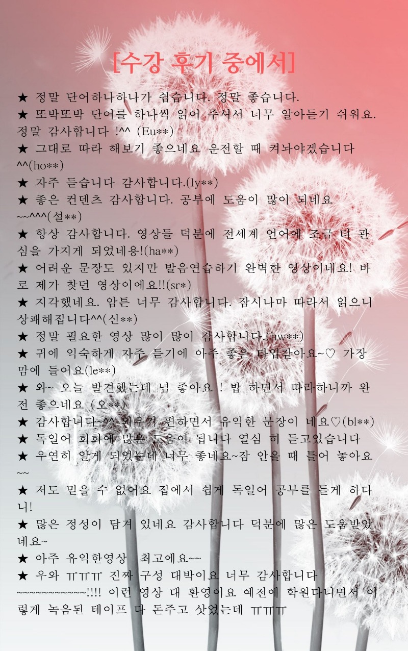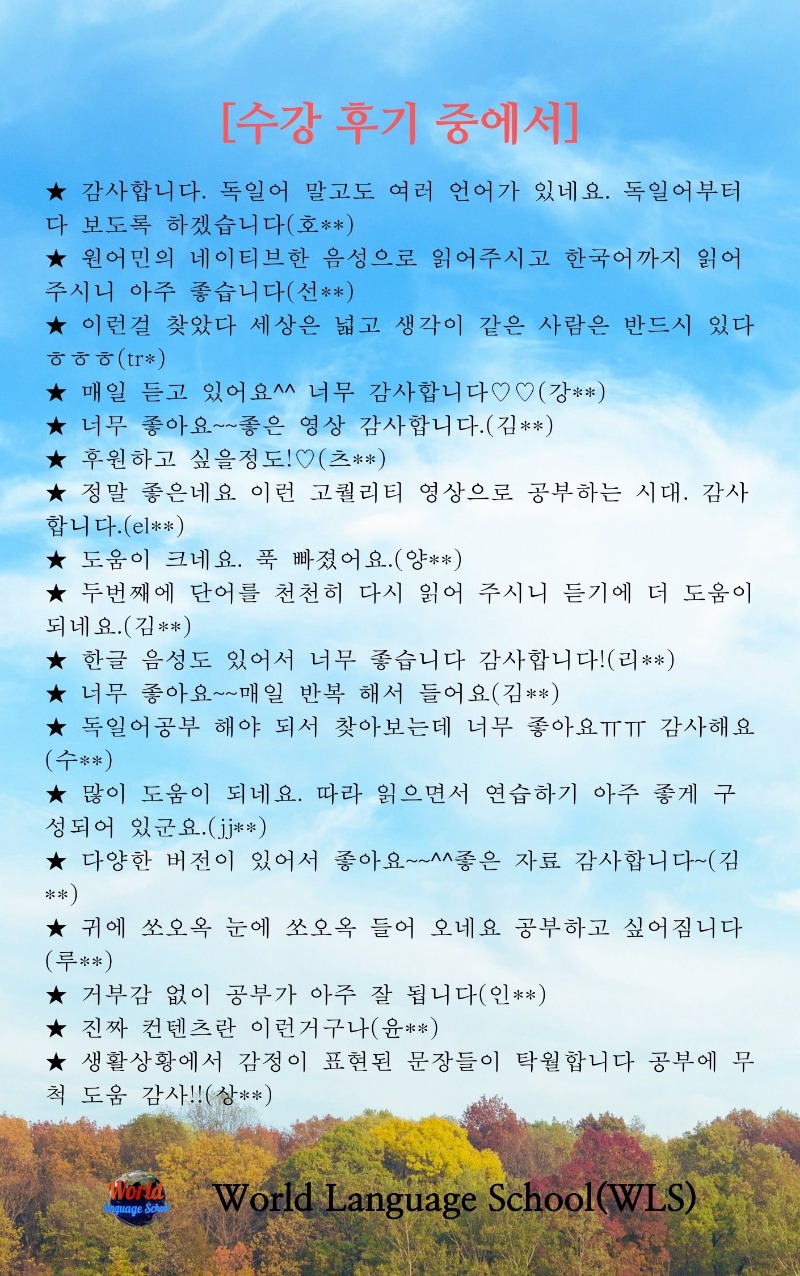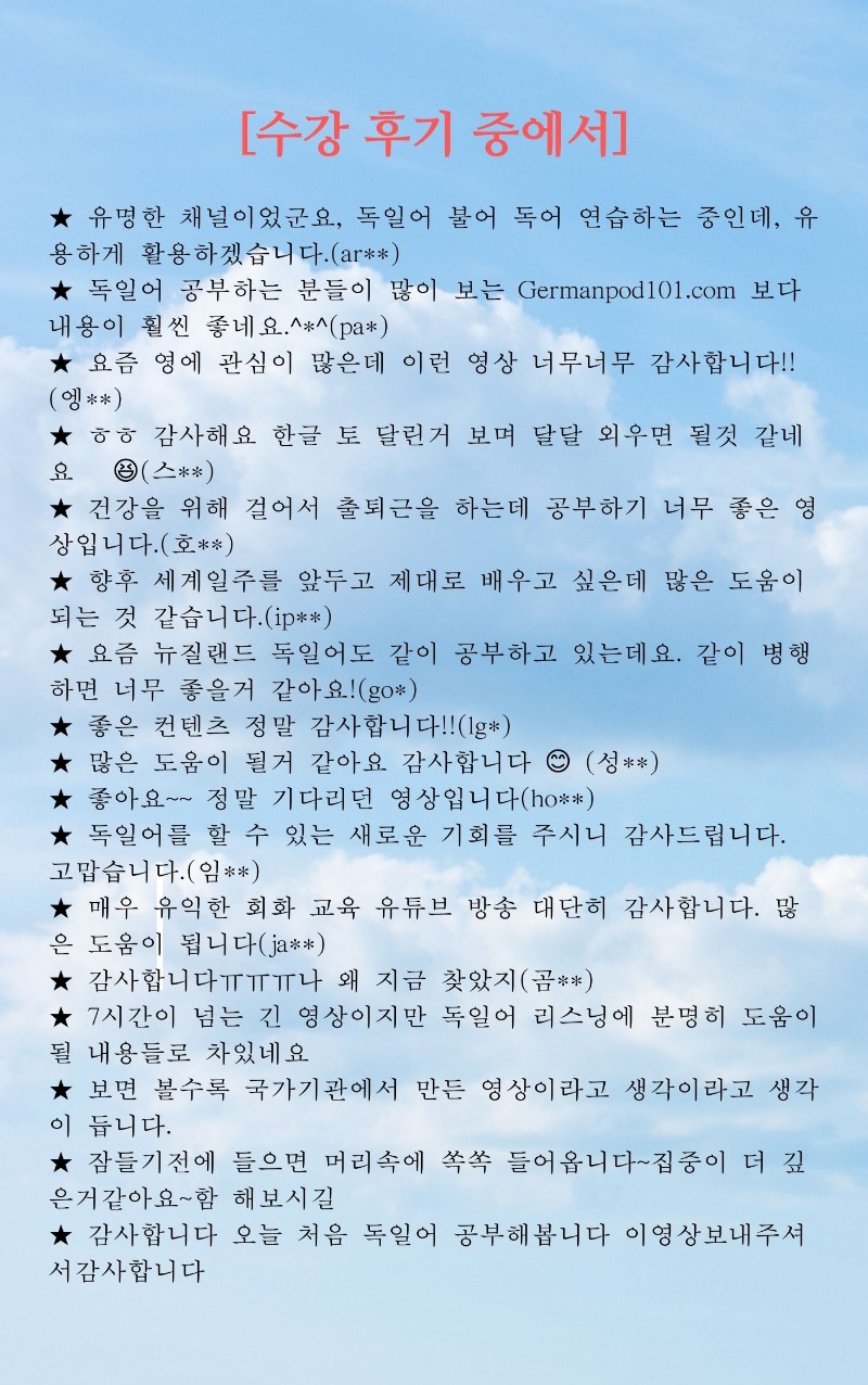★ 독일어를 할 수 있는 새로운 기회를 주시니 감사드립니다. 고맙습니다.(임**)