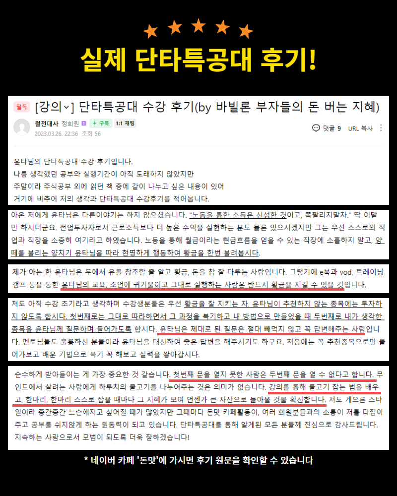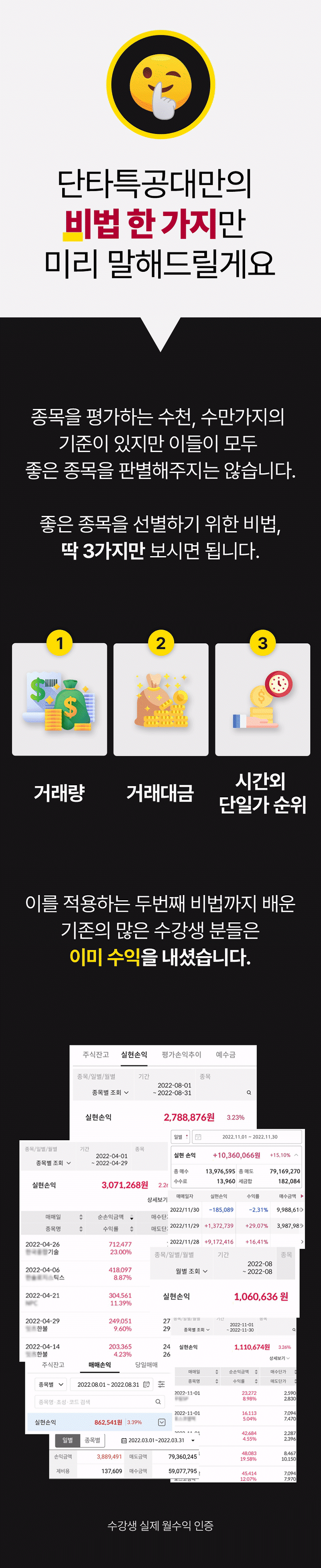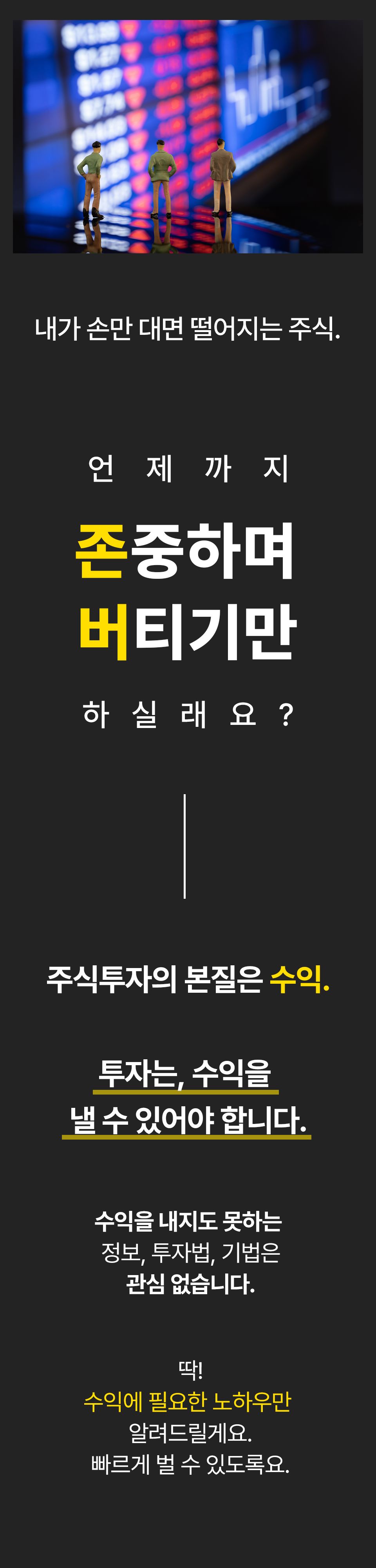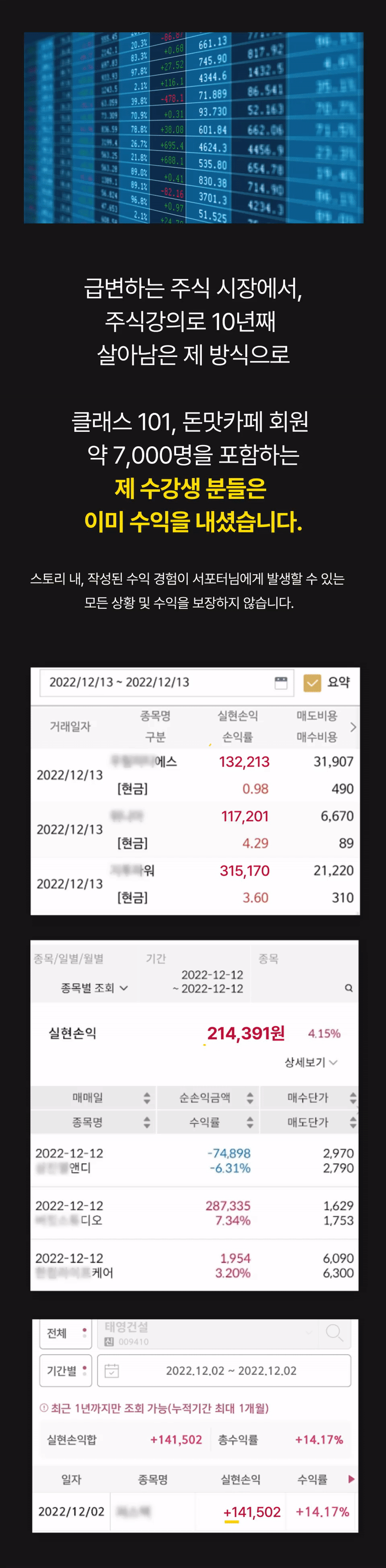 저처럼 경제적 위기를 겪고 있는 분들이나 겪으셨던 분들, 혹은 잘못된 공부로 주식투자에서 손실을 겪고 있는 분들, 그리고 제가 주식을 통해 얻었던 경험과 기쁨을 여러분도 함께 경험했으면 좋겠다는 마음에서 주식 강의를 시작하게 되었습니다.
