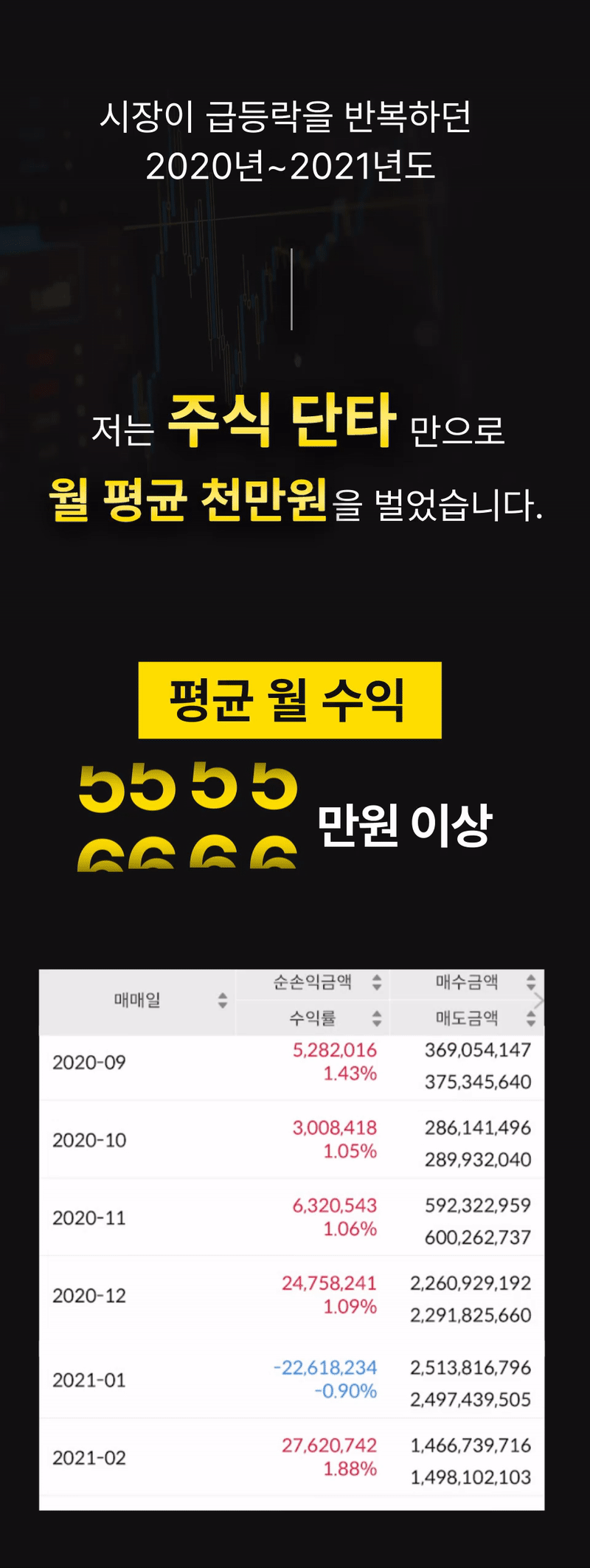 꾸준한 공부의 결실로 차트+재무+재료를 기반으로 주식을 투자하는 제 나름의 방식을 찾았고, 코로나 공황에서도 결국 좋은 종목은 상승이 있다는 것을 스스로 증명해냈습니다.그리고 20년도 폭등장 이후 길고 긴 하락장 속에서도 단타로 꾸준히 수익을 내고 있습니다.