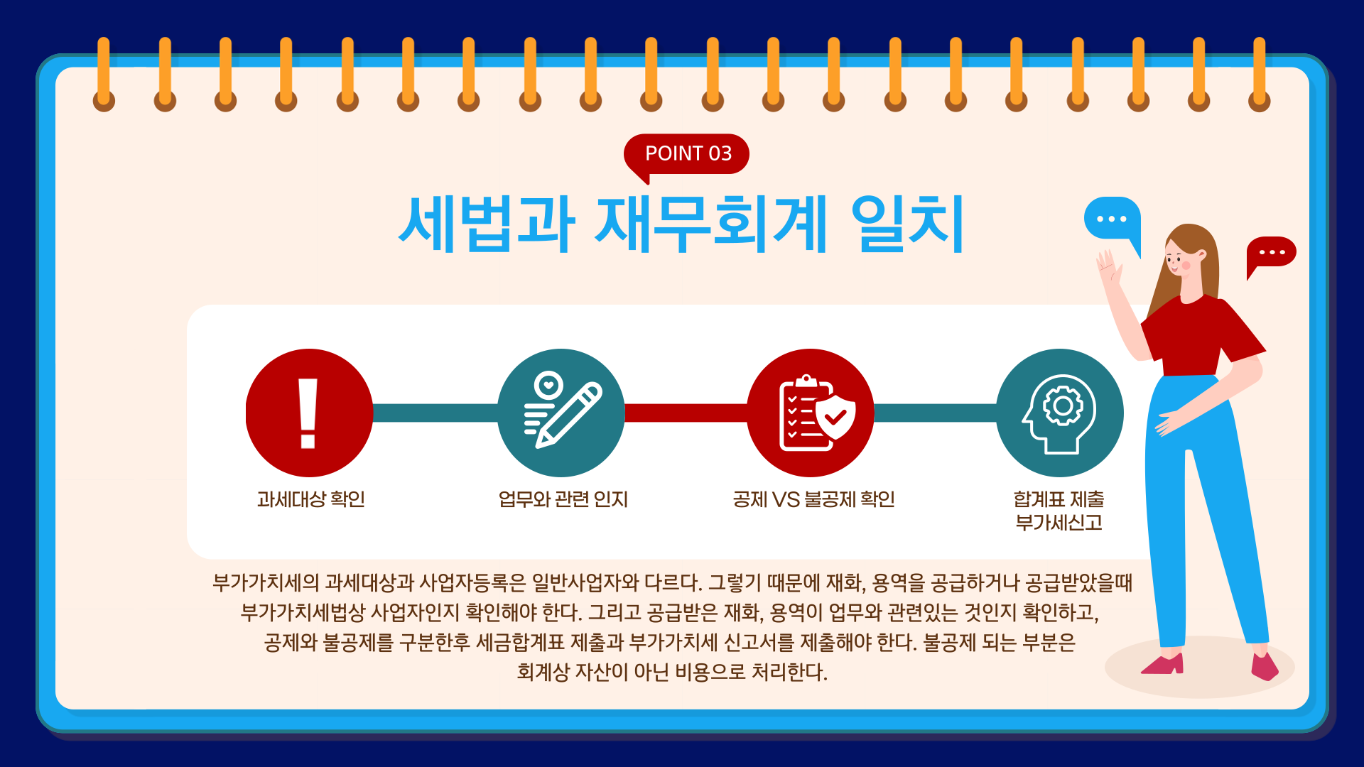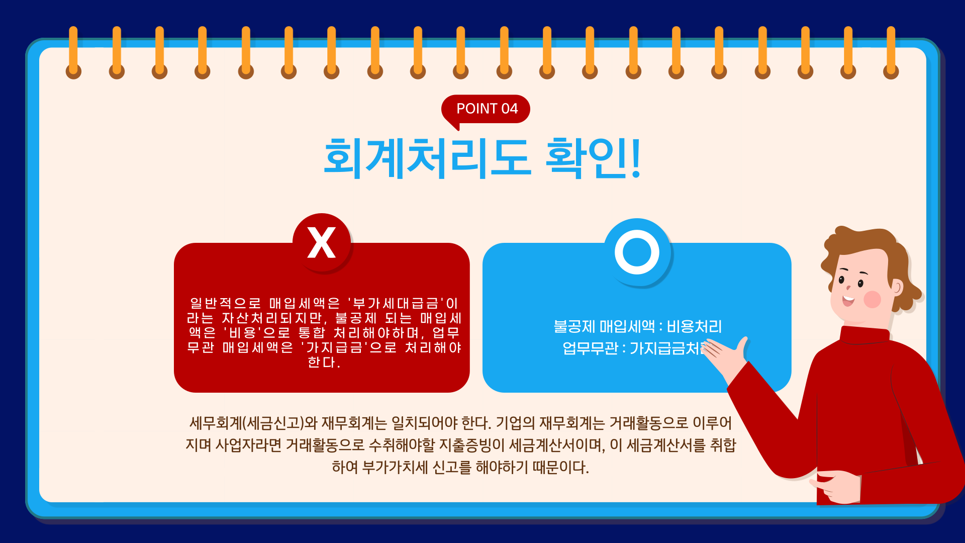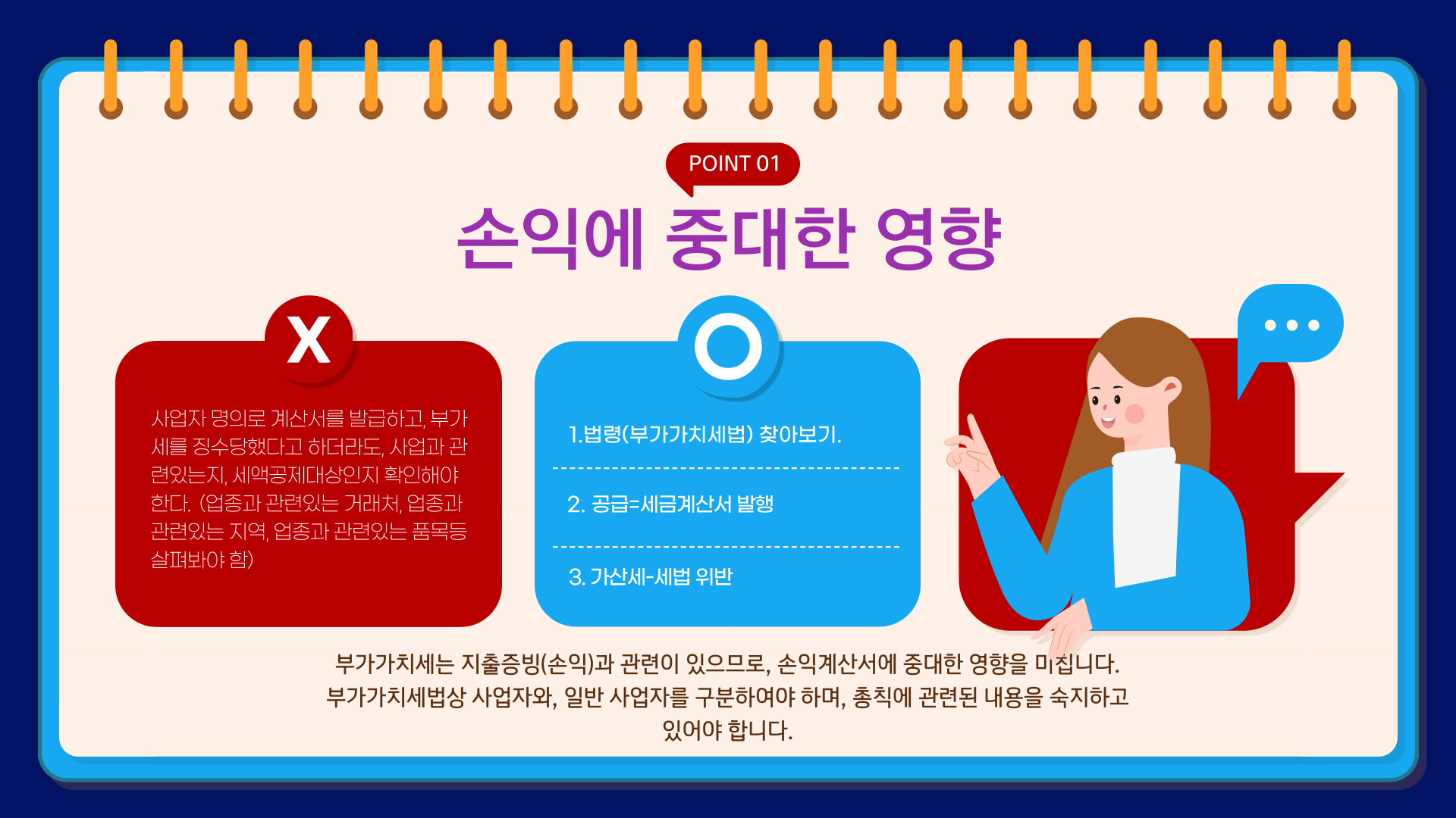 부가가치세는 사업과 관련된 투자(손익 및 자산)에 대한 법정 지출 증빙을 보관하고 신고하는 업무를 의미합니다. 법정 지출 증빙은 주로 세금계산서, 신용카드 영수증, 현금 영수증으로 구분됩니다. 기업의 회계 기록은 업무와 밀접한 관련이 있으며, 적절한 증빙을 갖추어야만 경비로 인정받을 수 있습니다. 따라서 부가가치세 납부를 회피하기 위해 증빙을 수취하지 못할 경우, 해당 지출을 경비로 처리할 수 없게 되어 경비에서 제외되고, 이로 인해 순이익이 증가하며 소득세 및 법인세 부담이 증가하게 됩니다. 부가가치세는 업무와 무관한 지출이나 증빙 미수취로 인해 부담이 발생할 뿐만 아니라, 소득세 부담도 함께 증가하므로 각별한 주의가 필요합니다.