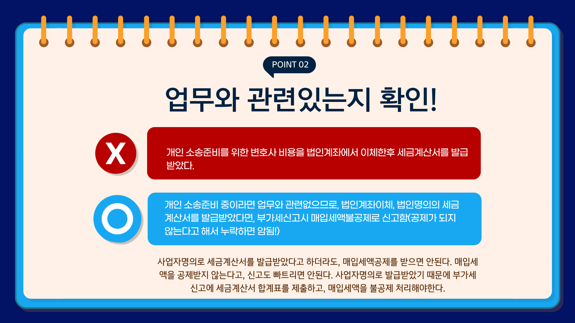 부가가치세 매입세액 공제는 사업자 명의로 증빙을 수취하였다고 하여도 징수된 부가가치세 전액을 공제받을 수 있는 것은 아닙니다. 매입이 사업과 관련된 것인지, 또는 업무용 승용차와 관련된 소비인지 여부를 면밀히 검토해야 합니다. 또한, 사업과 무관하게 지출된 금액은 공제 대상에서 제외되므로, 부가가치세 매입세액 공제의 구분이 매우 중요합니다.