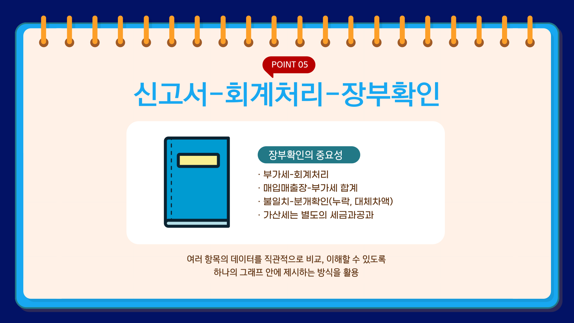 신고서와 재무제표의 계정과목은 일치해야 하나, 간혹 불일치하는 경우가 발생할 수 있습니다. 매입매출장은 기업에서 반드시 작성해야 하는 서류는 아니나, 계정과목이 상이할 경우 보조장부를 활용하여 일치시키는 절차를 진행해야 합니다.