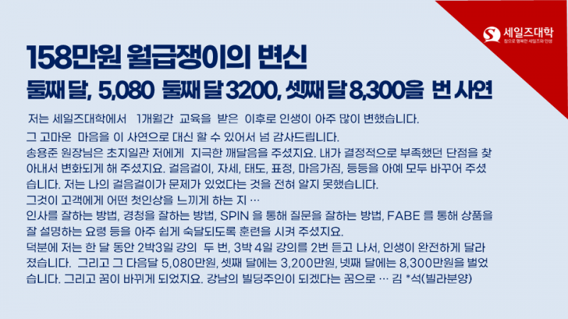 ㅡ현재도 가평 세일즈대학에서 매주 수 많은 수강생을 양성하고 있습니다