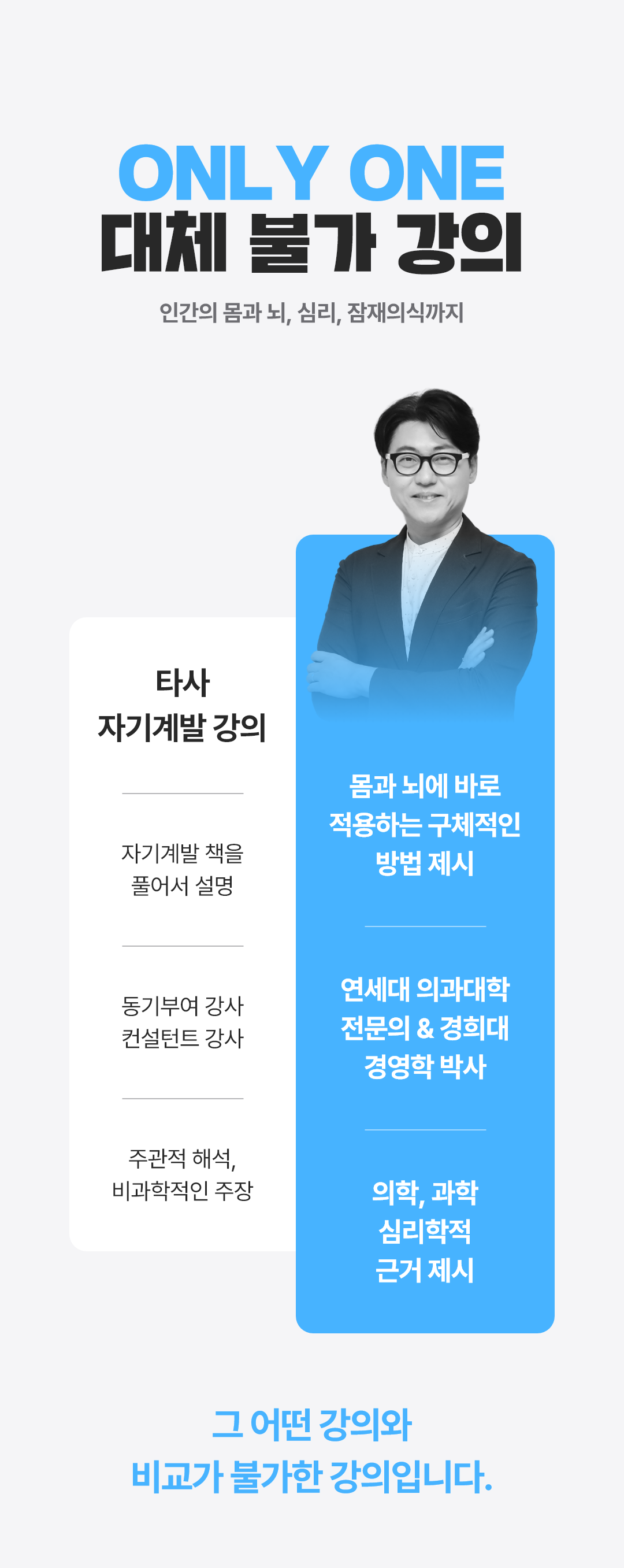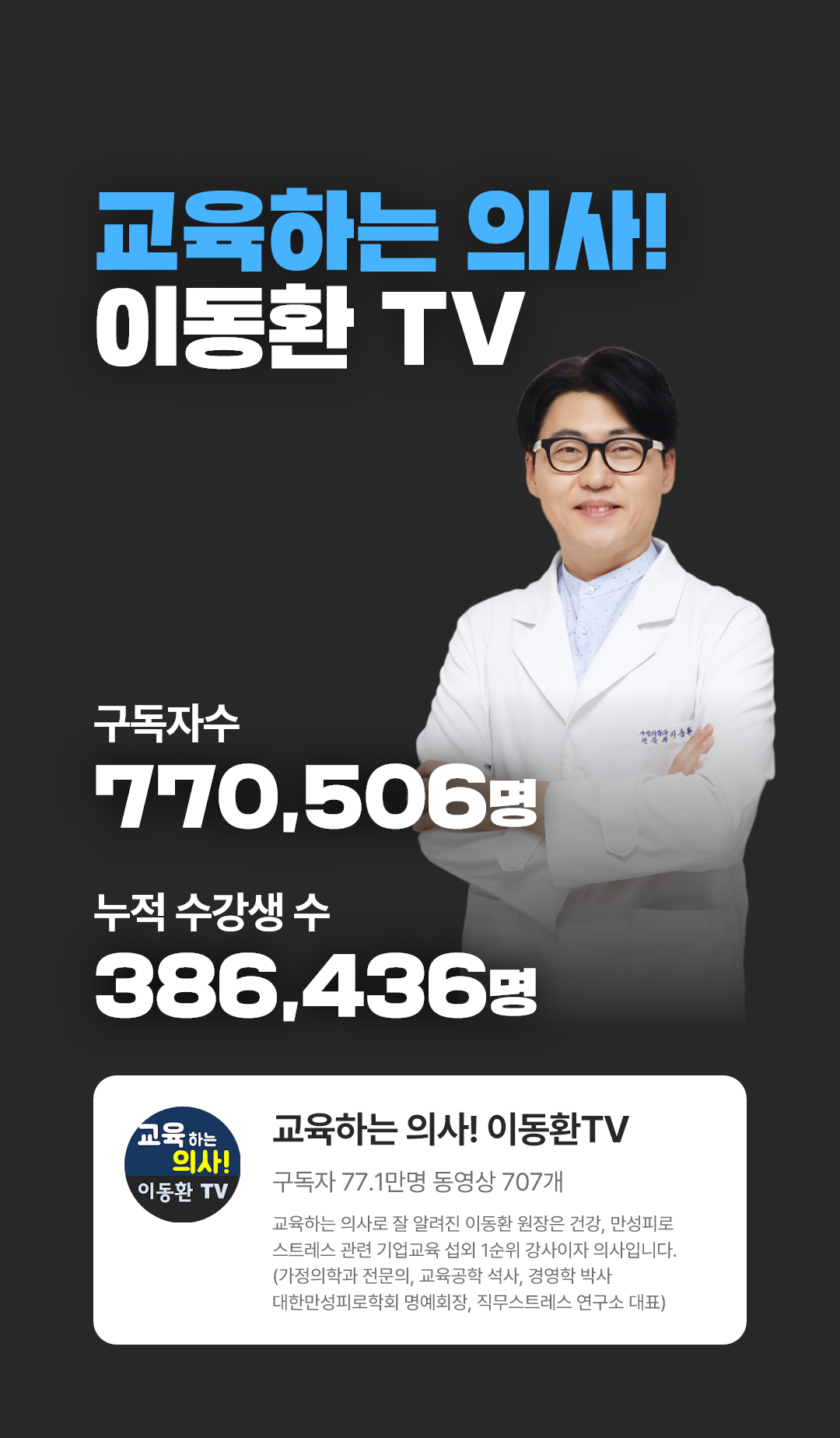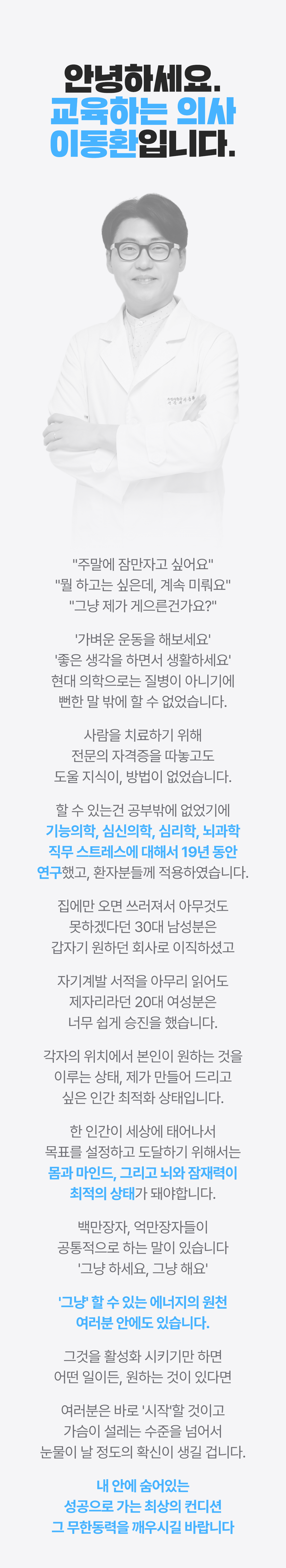 16년간 심신 무기력으로 성과를 못내는 사람들을 치료했습니다. 그리고 아주 중요한 원리를 깨달았고, 그 후 교육공학석사, 경영학박사가 되었습니다. 지금은 진료를 하지 않고 교육하는 의사로 77만 구독자 유튜버, 스트레스 관리, 자기관리, 동기부여, 자기계발 관련 기업강의 1타강사로 활동하고 있습니다.