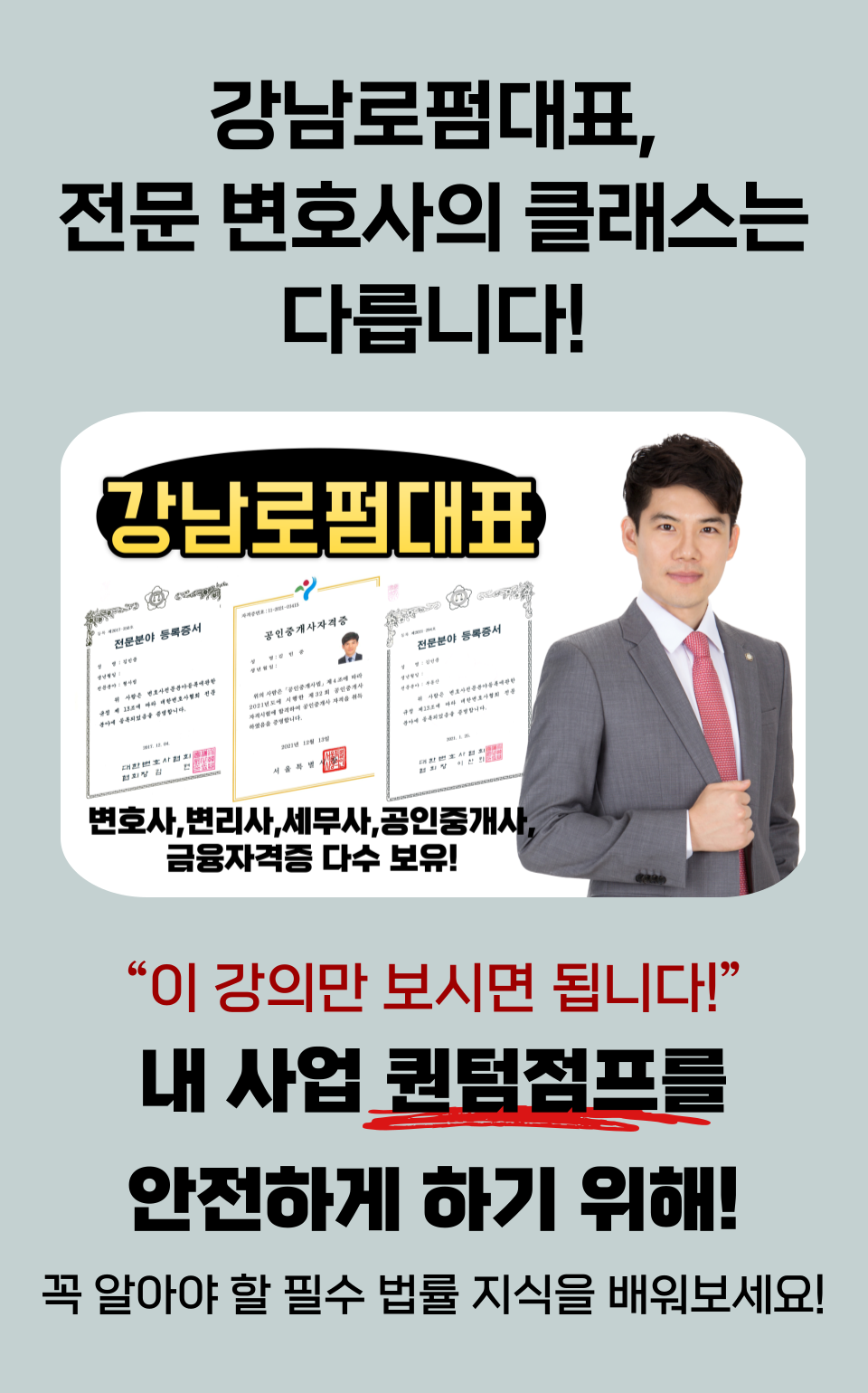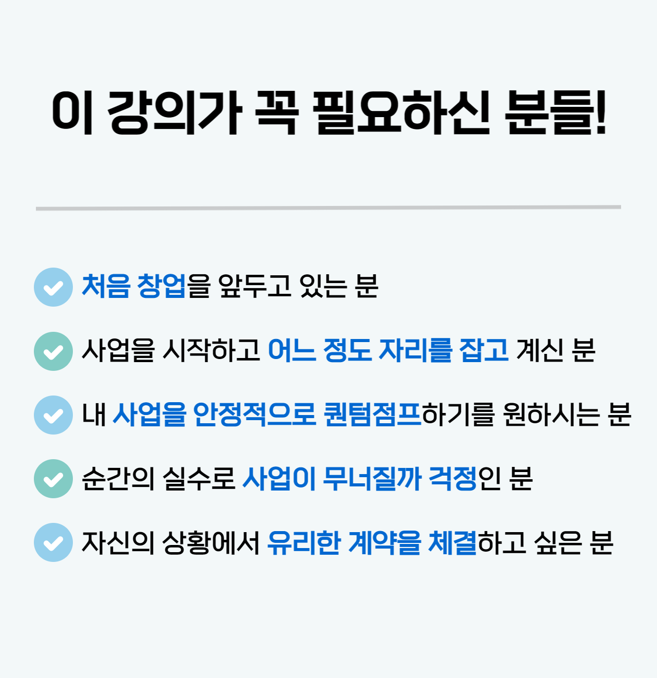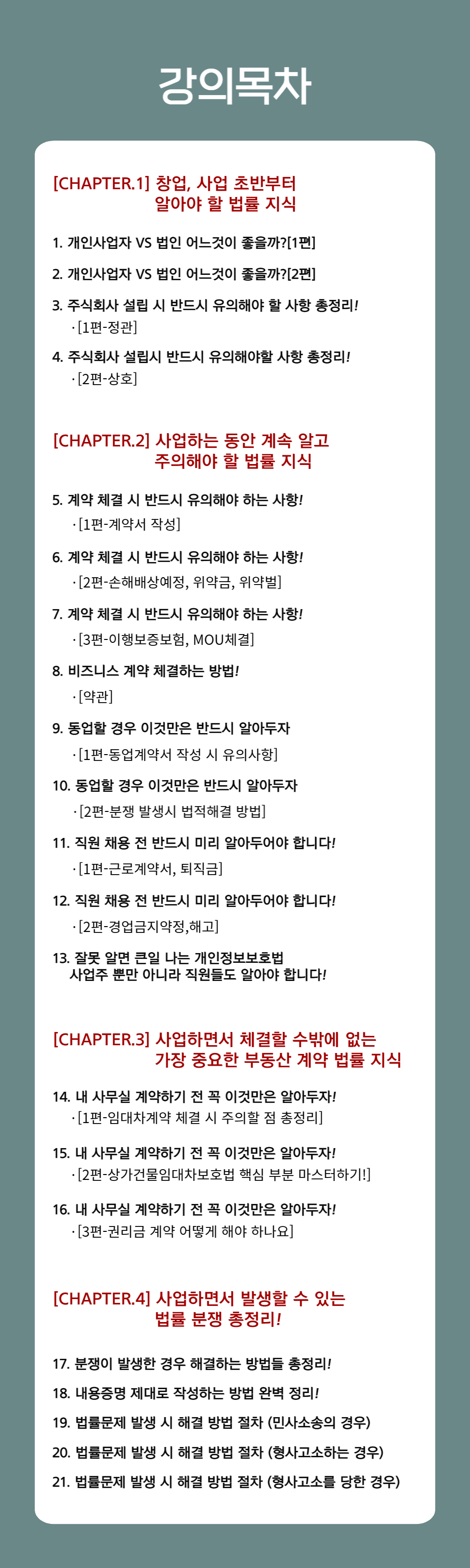 안녕하세요. 11년 차 강남 로펌 대표 변호사 김민중입니다. 수 천 건 이상 법률 상담을 해오면서 창업, 사업을 별다른 준비도 없이 막연하게 준비하시는 분들이 많다는 사실에 많이 놀랐습니다. 로펌에는 사건이 발생한 이후에 찾아오시는 분들이 거의 대부분입니다. 조그만 법률 지식만 있었어도 사건이 발생하지 않았을 텐데 이 법률 지식을 몰라 큰 소송과 피해를 입고 계신 분들이 많아 정말 안타까운 생각이 들었습니다. 그리고 현재 창업가, 사업가를 위한 필수 법률 지식에 대한 강의가 전혀 없는 사실도 놀라웠습니다. 이에 제가 창업, 사업하시는 분들이 반드시 알아야 할 엑기스 법률 지식들만 집대성하여 체계적으로 정리하였습니다. 이 강의를 잘 듣고 익히셔서 저의 11년 변호사 노하우를 모두 흡수해가시기 바랍니다.