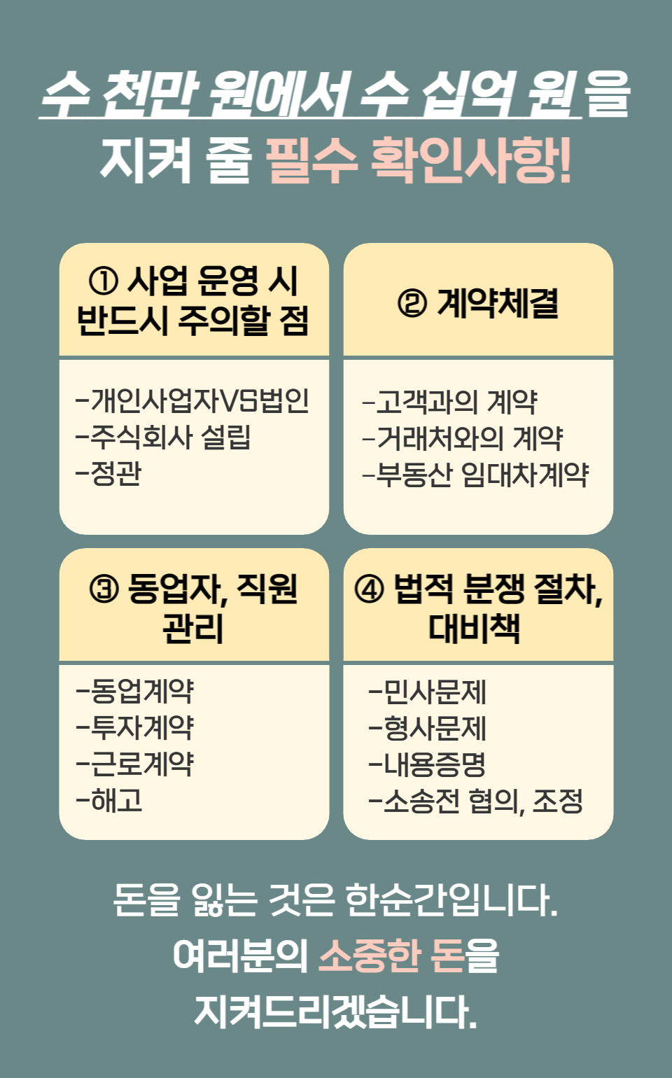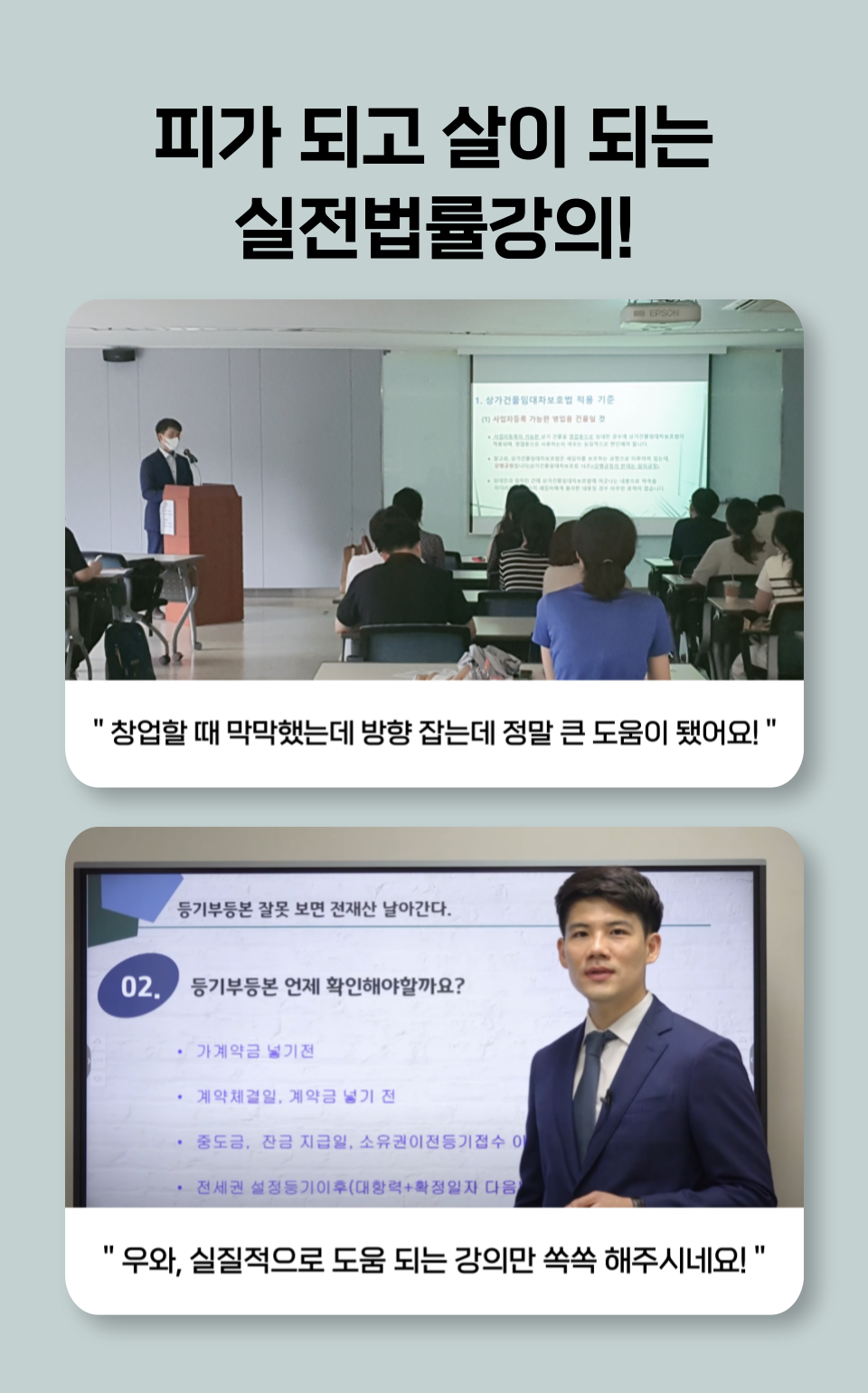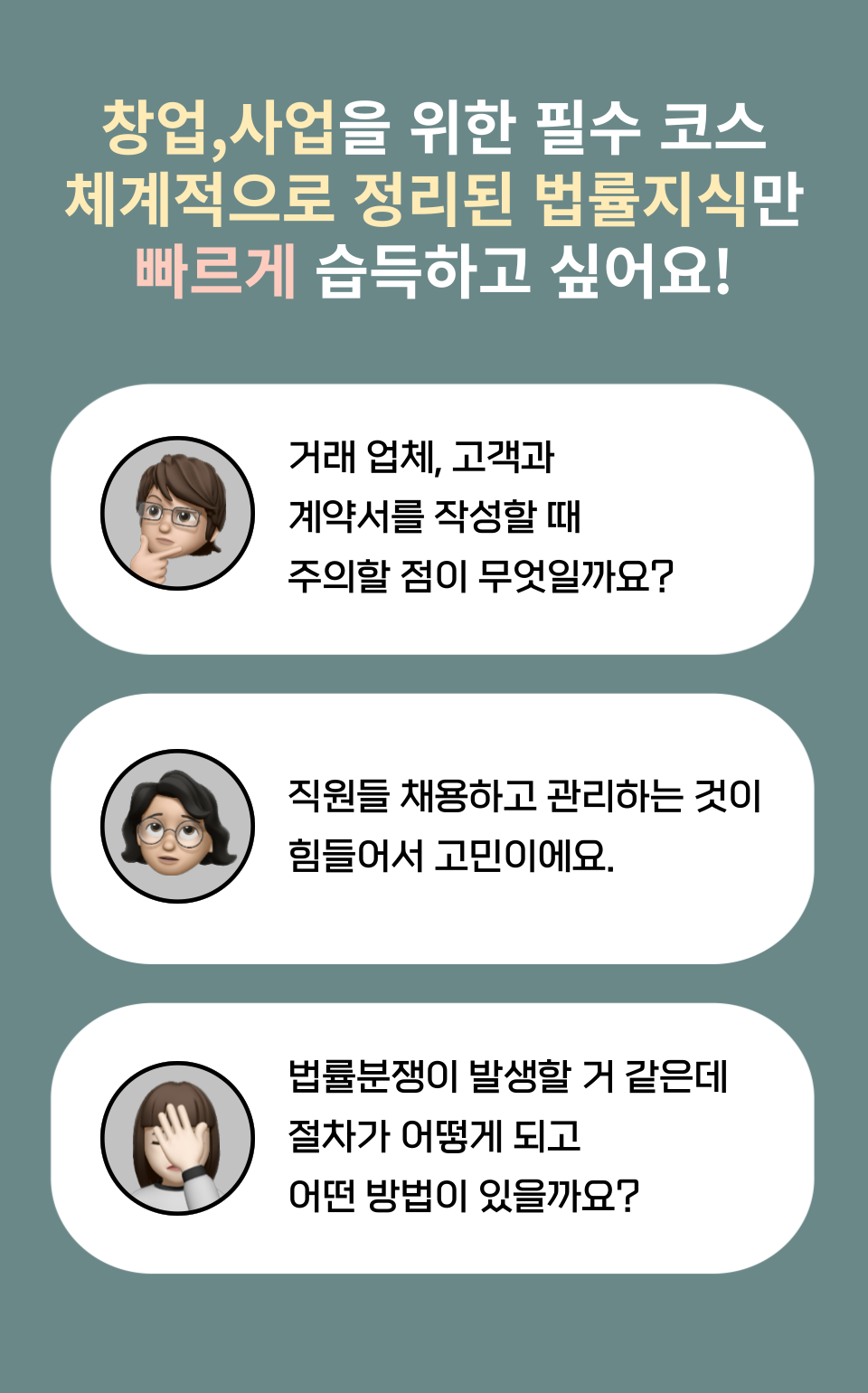 안녕하세요. 11년 차 강남 로펌 대표 변호사 김민중입니다. 수 천 건 이상 법률 상담을 해오면서 창업, 사업을 별다른 준비도 없이 막연하게 준비하시는 분들이 많다는 사실에 많이 놀랐습니다. 로펌에는 사건이 발생한 이후에 찾아오시는 분들이 거의 대부분입니다. 조그만 법률 지식만 있었어도 사건이 발생하지 않았을 텐데 이 법률 지식을 몰라 큰 소송과 피해를 입고 계신 분들이 많아 정말 안타까운 생각이 들었습니다. 그리고 현재 창업가, 사업가를 위한 필수 법률 지식에 대한 강의가 전혀 없는 사실도 놀라웠습니다. 이에 제가 창업, 사업하시는 분들이 반드시 알아야 할 엑기스 법률 지식들만 집대성하여 체계적으로 정리하였습니다. 이 강의를 잘 듣고 익히셔서 저의 11년 변호사 노하우를 모두 흡수해가시기 바랍니다.