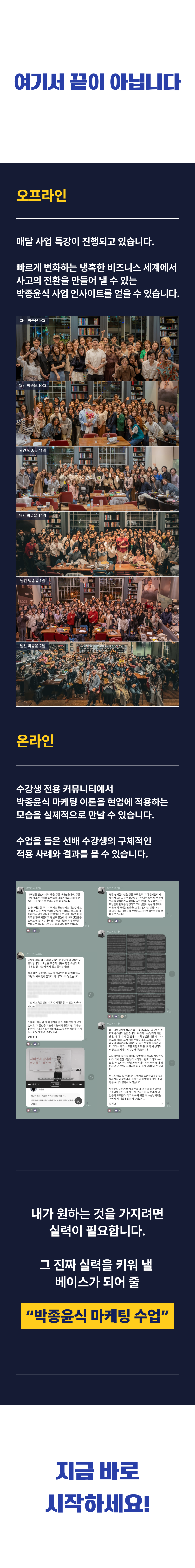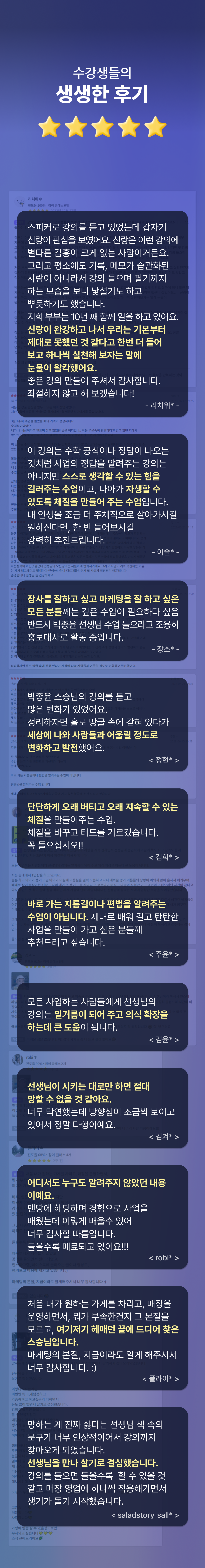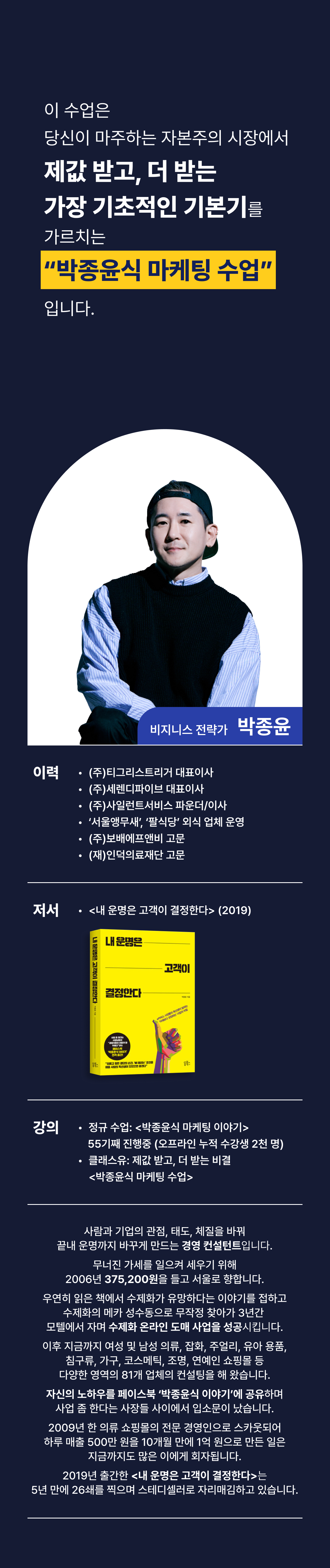 안녕하세요 박종윤 선생님의 강의를 제공하고 있는 사일런트서비스 입니다. 사일런트서비스는 박종윤 선생님의 제자들로 이루어진 회사 입니다. 7년전 특강을 듣고 공부하기 시작한 인연으로 시작 되어 지금까지 함께 운영하고 있습니다. 적지 않은 시간동안 정말 많은 분들이 한계를 돌파했고 지금은 안정적인 사업을 운영하고 있습니다. 수업을 신청하셨다면 꼭꼭 씹어서 모조리 흡수하시길 바랍니다. 수업료 이상의 가치가 있다고 자신있게 권합니다.
