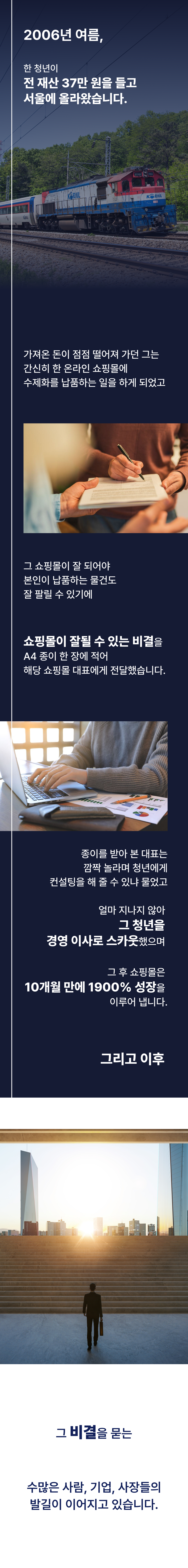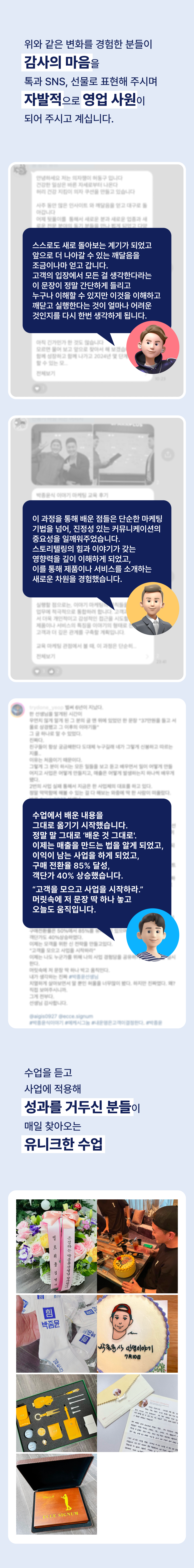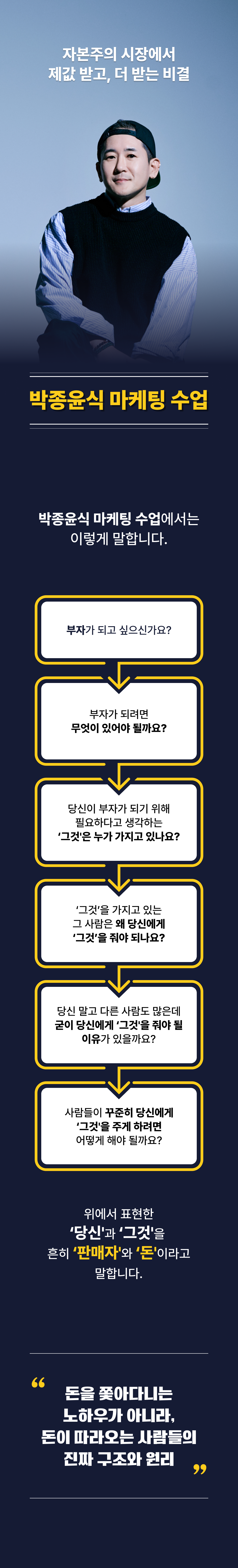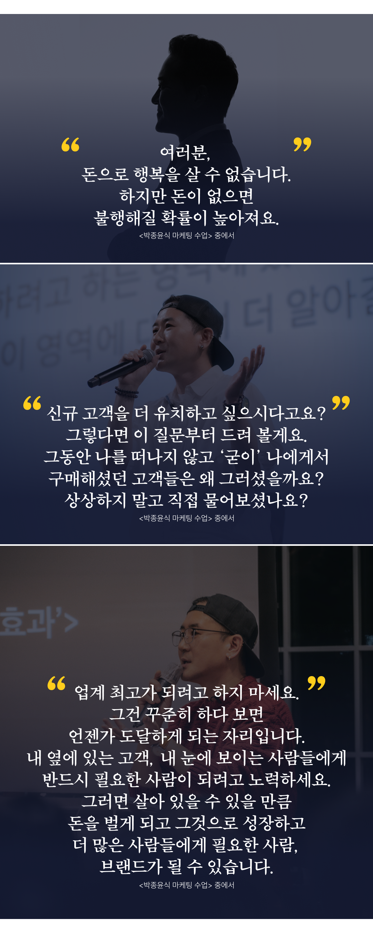 안녕하세요 박종윤 선생님의 강의를 제공하고 있는 사일런트서비스 입니다. 사일런트서비스는 박종윤 선생님의 제자들로 이루어진 회사 입니다. 7년전 특강을 듣고 공부하기 시작한 인연으로 시작 되어 지금까지 함께 운영하고 있습니다. 적지 않은 시간동안 정말 많은 분들이 한계를 돌파했고 지금은 안정적인 사업을 운영하고 있습니다. 수업을 신청하셨다면 꼭꼭 씹어서 모조리 흡수하시길 바랍니다. 수업료 이상의 가치가 있다고 자신있게 권합니다.