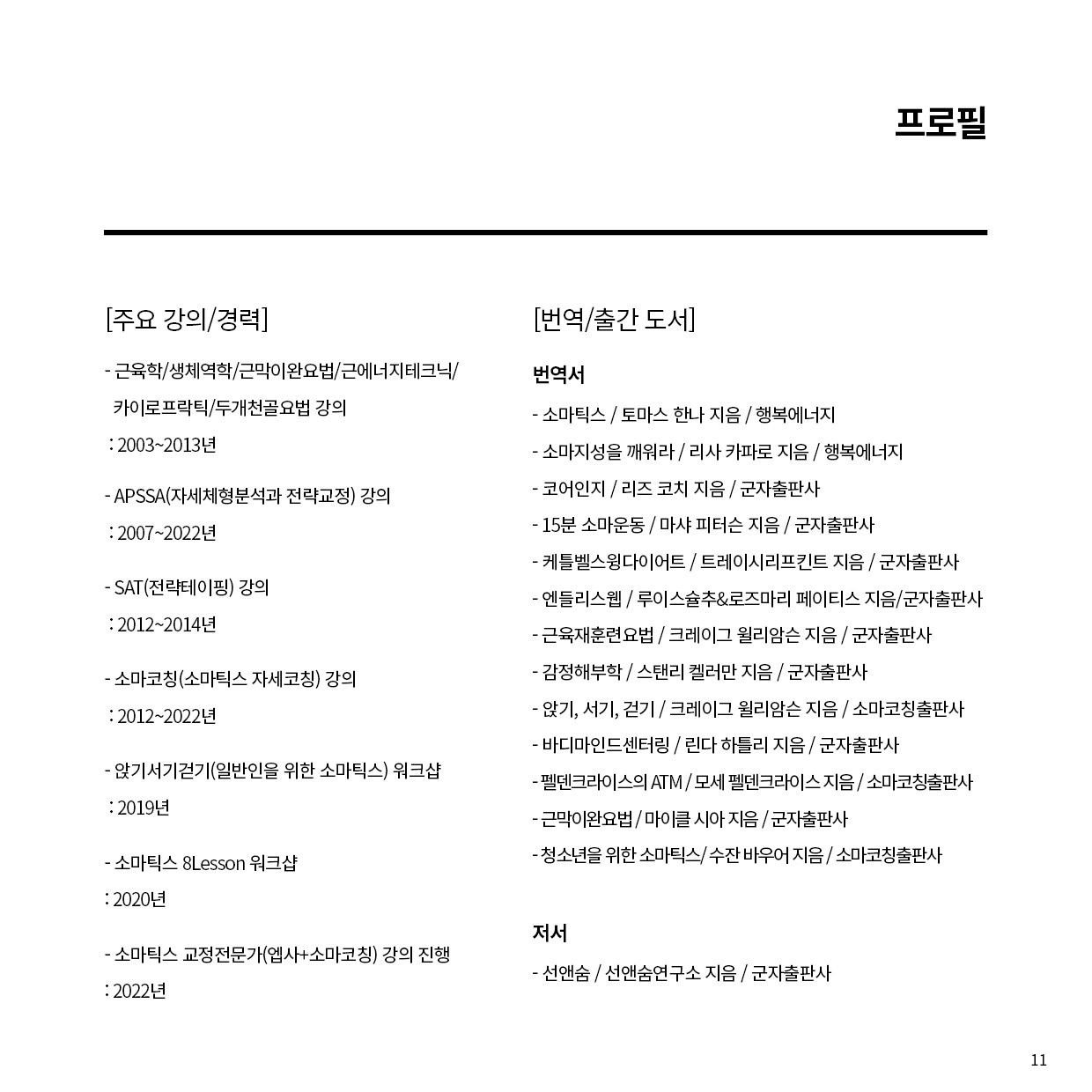 2006년부터는 KS바디워크소마틱스연구소(현 소마코칭연구소)를 설립해 바디워크와 소마틱스 원리를 활용한 교정 강좌와 해부학, 생리학, 근육학, 운동학, 전략교정테이핑, 근막이완요법 등의 강의를 진행하고 있습니다. 2017년에는 소마코칭스튜디오를 설립하였고, 현재는 전문가 양성과정(엡사)뿐만 아니라, 명상 수련 프로그램인 선앤숨 에너지명상(www.sunnsum.com)도 가르치고 있습니다.