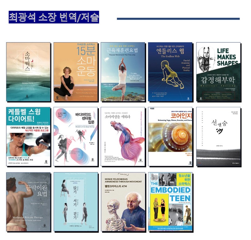 번역서로는 [소마틱스], [소마지성을 깨워라], [코어인지], [15분 소마운동], [케틀벨스윙 다이어트], [엔들리스웹], [근육재훈련요법], [감정해부학], [앉기서기걷기], [바디마인드센터링 입문], [펠덴크라이스의 ATM], [근막이완요법], [청소년을 위한 소마틱스]가 있고, 저서로는 [선앤숨]이 있습니다.