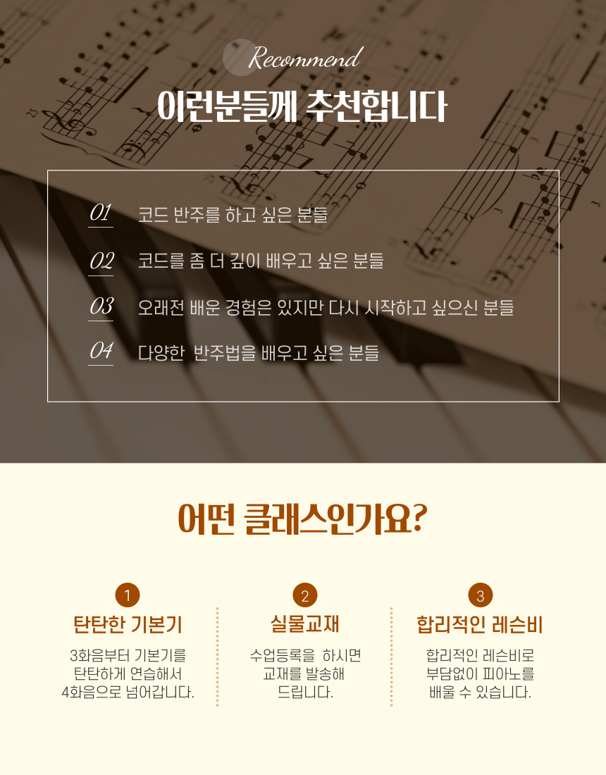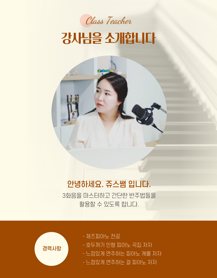 3화음을 만드는 방법부터 자리바꿈 그리고 다양한 반주를 배울 수 있습니다.