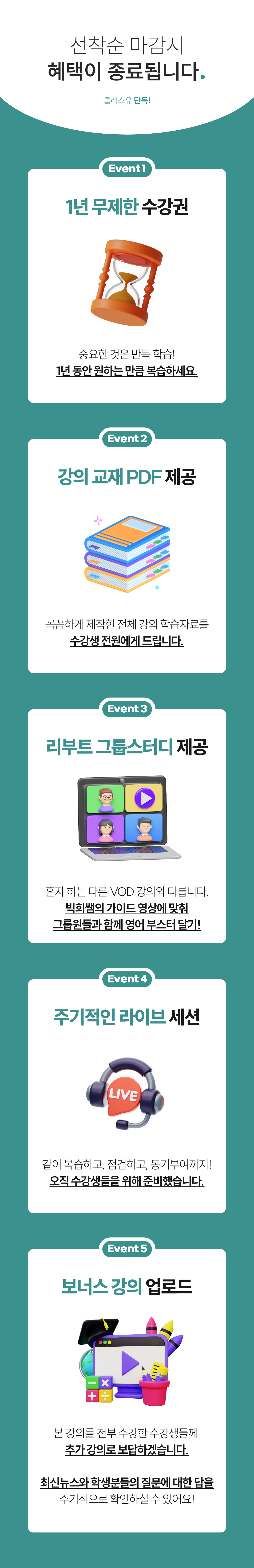 이번 클래스유의 강의는 지금까지 여러분이 알고 계신 초,중,고 에서 학습하신 내용을 통으로 복습하며 북미식 영어 수업을 접목시킨 회화가 되는!
