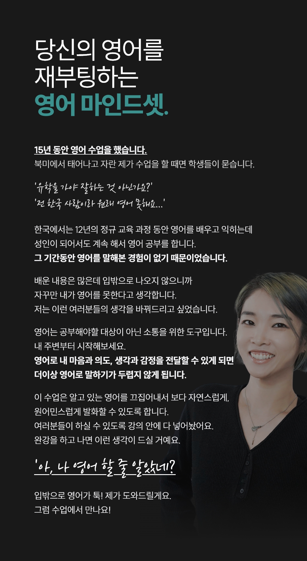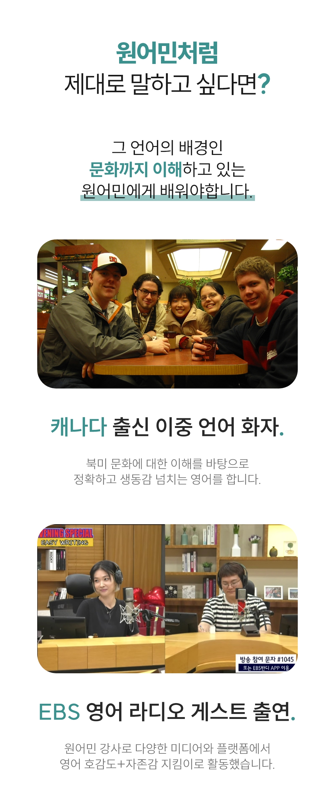 16년차 원어민 강사이자, 영어 컨설턴트로 많은 학생들의 영어 방향, 공부, 진로, 시험준비, 유학 그리고 이민 준비를 돕고 있습니다.