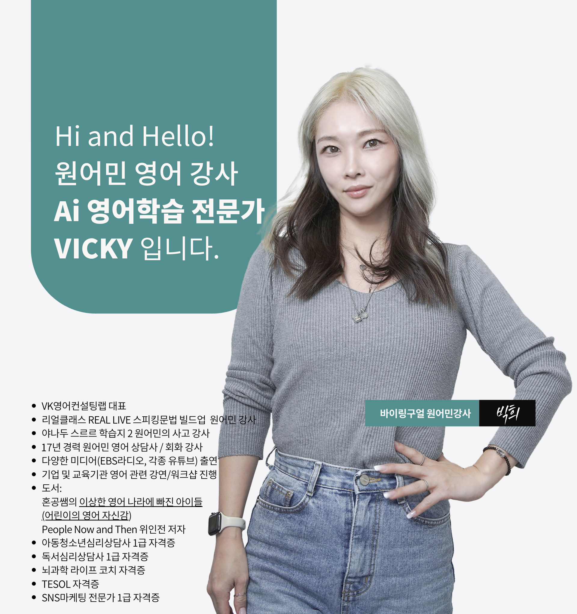 "왜 우리는 12년을 공부하고도 외국인 앞에서 작아질까요?" 그건 여러분의 실력이 부족해서가 아니라, 뇌에 저장된 영어를 꺼내는 '인출 회로'가 설계되지 않았기 때문입니다. 17년 차 원어민 강사이자 영어 컨설턴트인 빅희(Vicky)가 여러분의 영어 자존감을 완벽하게 복원해 드립니다.