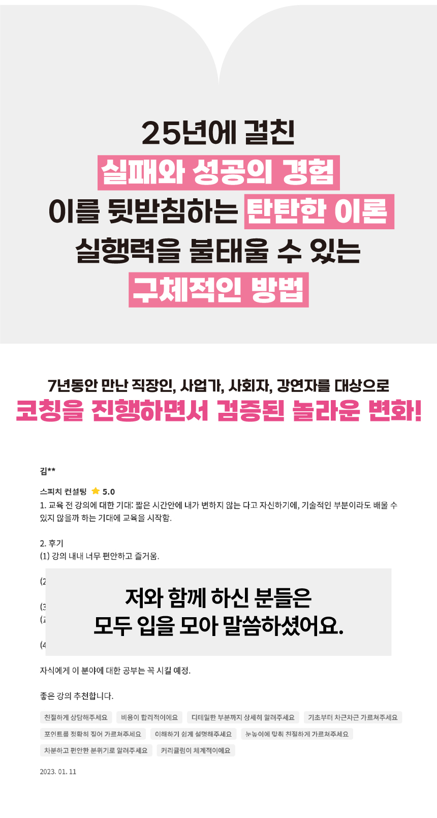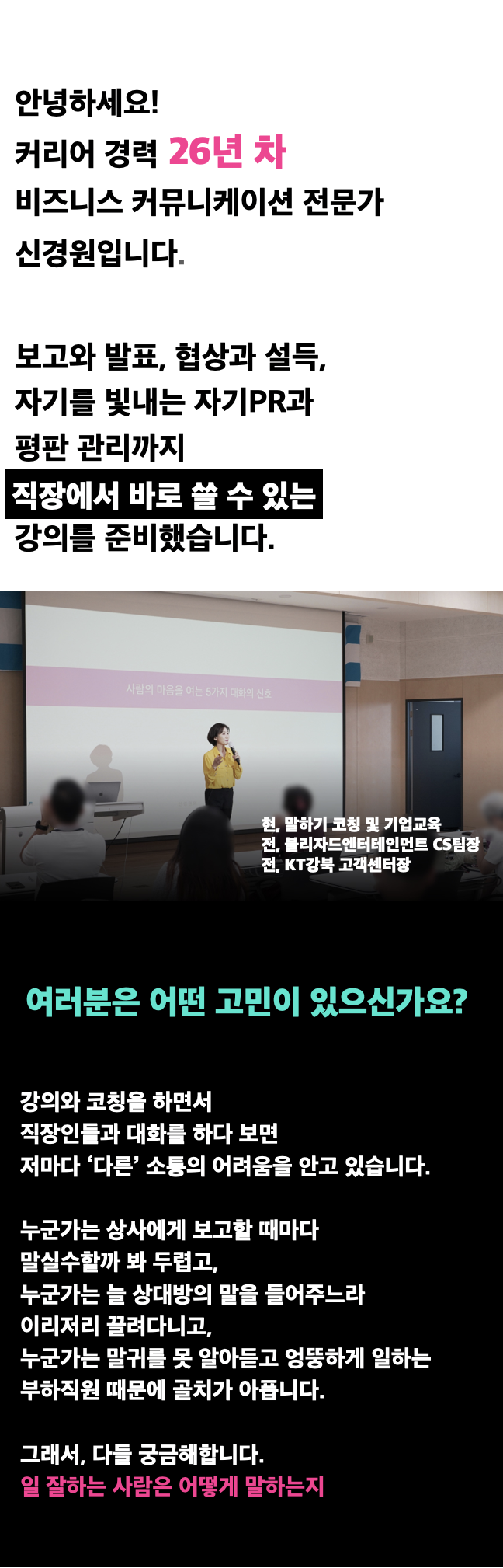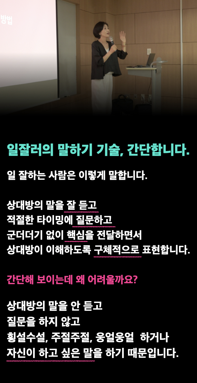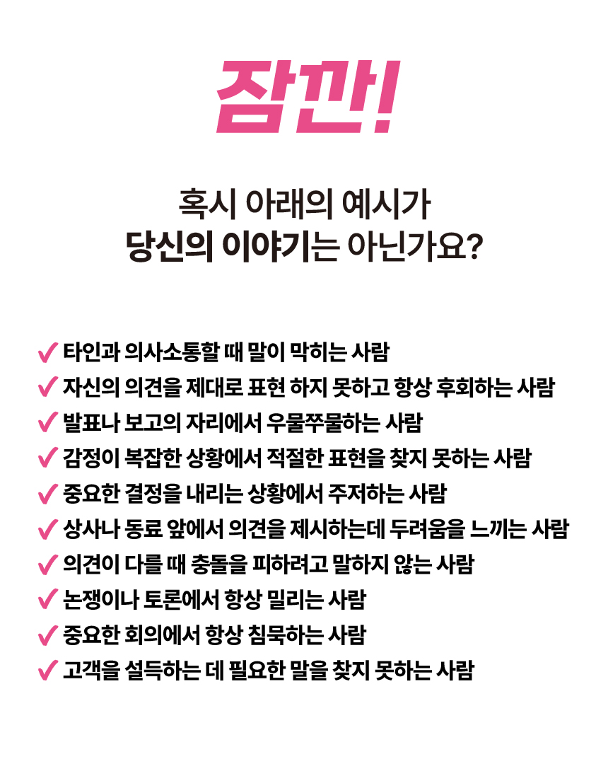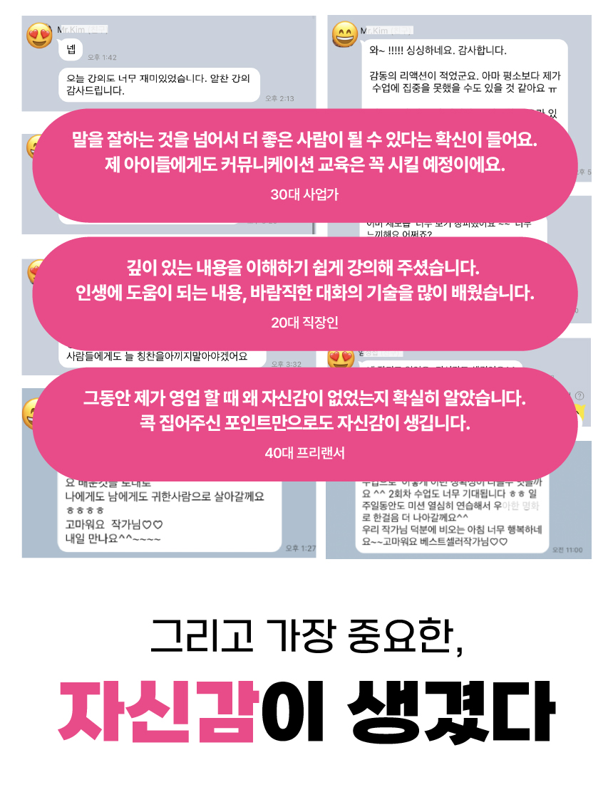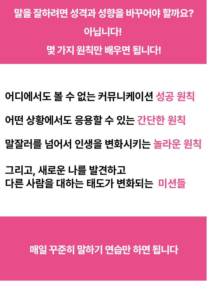 저는 말을 못 하는 인생으로 30년 넘게 살았습니다. 설득이나 협상 스킬이 없어서 다른 사람에게 질질 끌려다니거나 요령 없이 덤볐다가 처참하게 패데기 쳐지며 10년 간 직장 생활을 했습니다. 막상 내가 해야 할 말을 잘할 수 있는 사람이 되어 보니 인생을 주도하는 것이 무엇인지 알게 되었습니다. 대화를 주도하지 못하면 일도, 관계도, 인생도 주도할 수 없습니다. 다른 사람에게 휘둘리면서 자신의 인생에서 (주인공이 아닌) 조연으로 살아가게 됩니다.