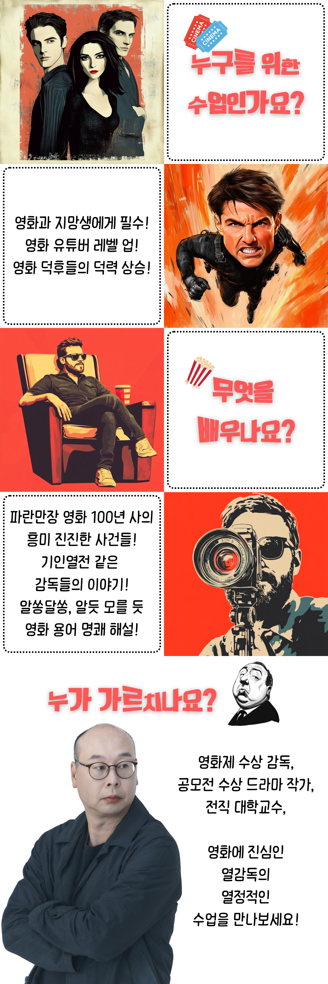 파란만장 영화 역사 100년! 영화 보다 더 드라마틱 한 사건들과 문제적 감독들의 이야기! 알듯 모를 듯 헷갈리는 영화 용어들을 장르 영화처럼 재미있게 예술 영화처럼 깊이 있게 강의합니다!