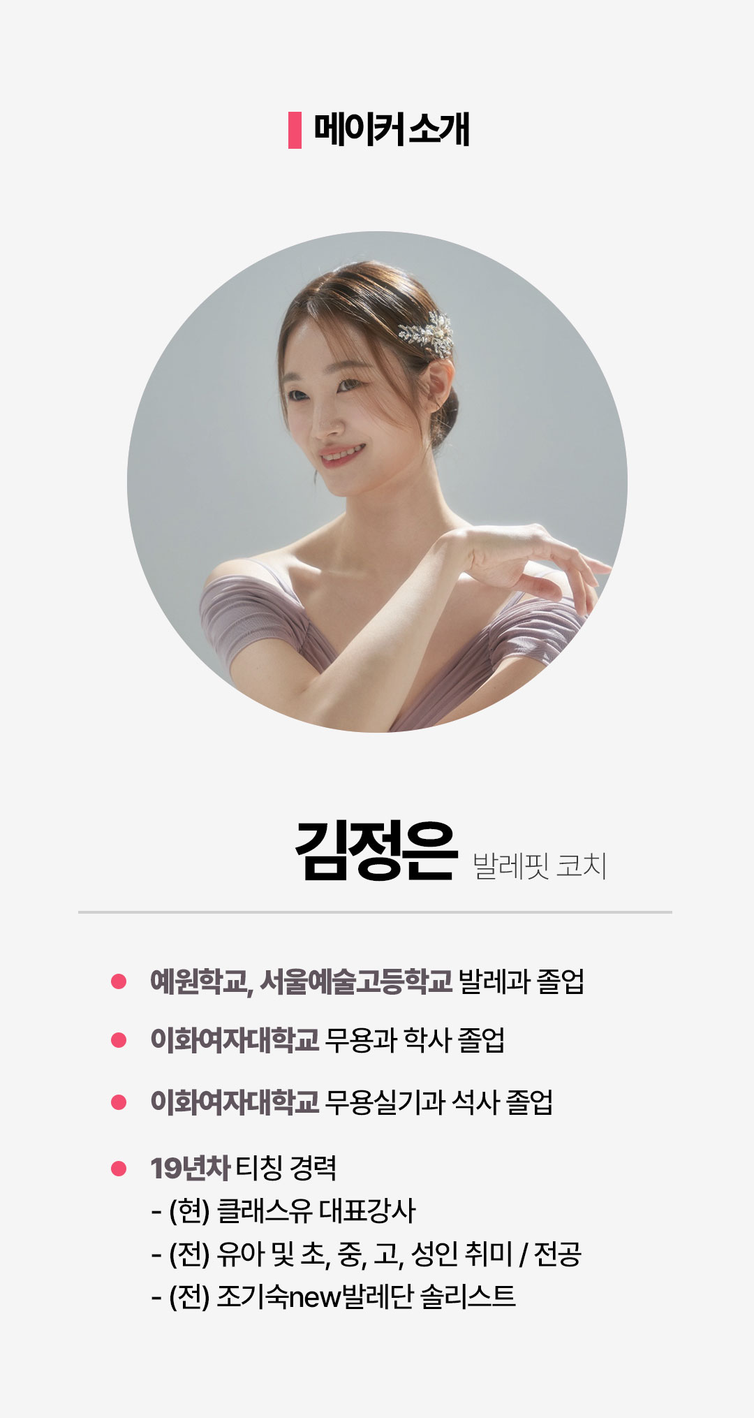 2006년부터 오프라인 발레강의를 시작하여 활동하다 2019년부터 온라인 클래스를 시작, 티칭을 이어가고 있는 19년차 발레 코치이다.