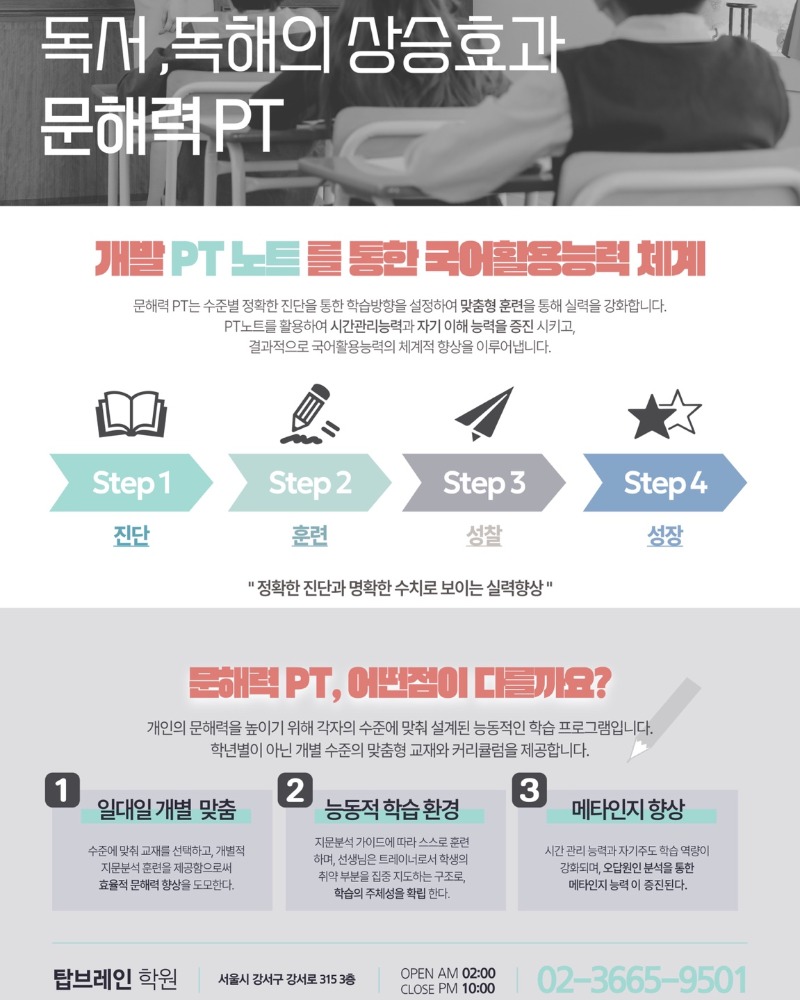 독서와 국어의 병행시스템이 학부모님들의 니즈가 되고 있고 고교학점제 시대에서도 정말 중요한 교육방법인 만큼 원장님들의 내신시스템 장착이 우리 아이들에게는 본질적인 문해력과 시험성적까지 얻게 해 줄 것입니다.