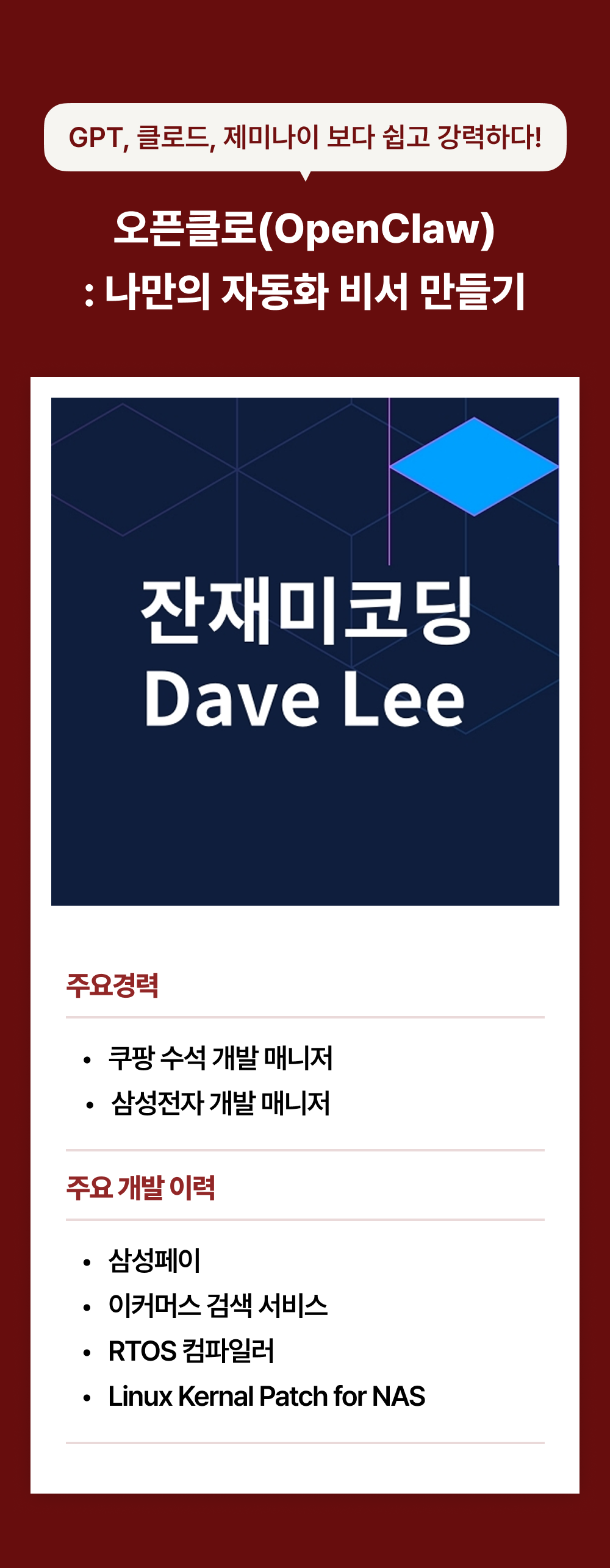 주요 경력: 쿠팡 수석 개발 매니저/Principle Product Manager, 삼성전자 개발 매니저 (경력 약 15년)