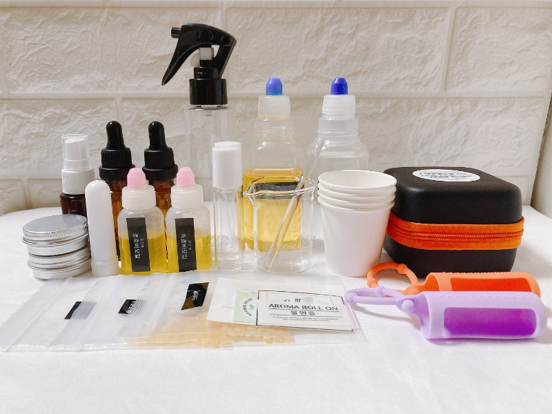 캐리어 오일, 비즈 왁스 등 원료 및 도구 등으로 구성된 키트를 이용하여