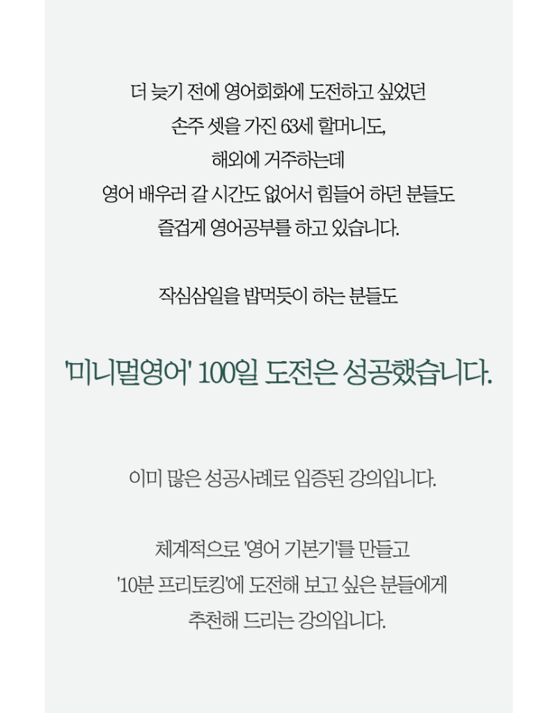이 경험을 통해 ‘성인이 된 후에도 영어는 누구나 할 수 있다’는 확신이 생겼고 예전의 저와 같은 처지에 있는 영어 초보자들에게 영어 멘토가 되어주고자 유튜브 채널을 시작했습니다.